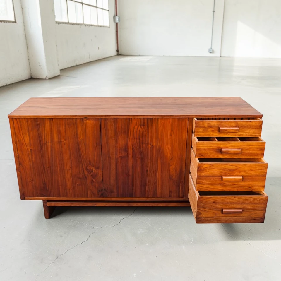 Step back in time with this stunning 1960s Mid Century Modern Studio Made Solid Walnut Credenza Sideboard, a true icon of vintage craftsmanship and timeless design. This exquisite walnut credenza features four grain-matched drawers and a spacious push-to-open cabinet, offering versatile storage solutions for your dining room, living space, or home office. The top drawers are felt-lined, making them ideal for storing silverware, jewelry, or other delicate items, while the large cabinet provides ample space for dinnerware, linens, or display pieces.