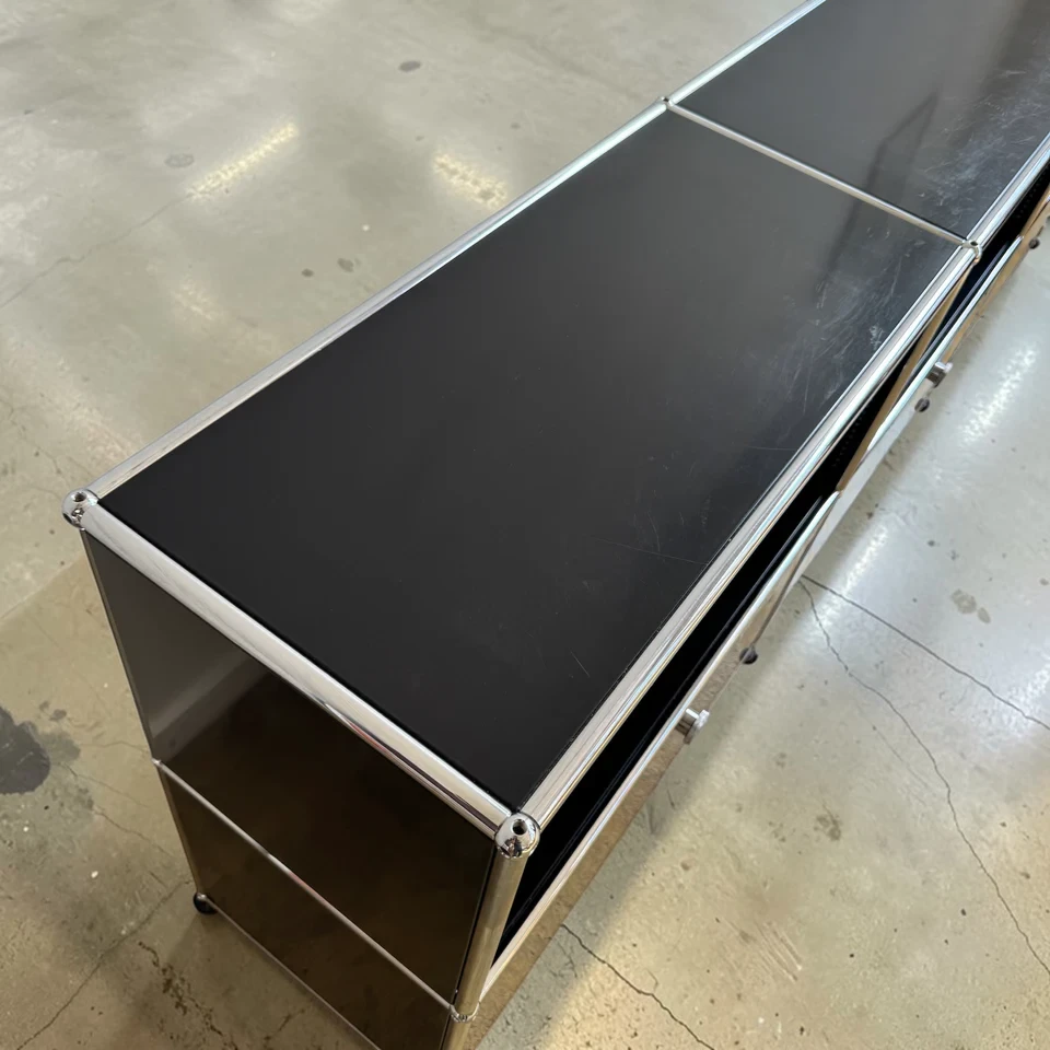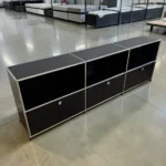 Iconic 1960s USM Haller 3×2 fully enclosed media console in Graphite Black. Designed by Fritz Haller. Six compartments, chrome frame, excellent condition. 89.5″W x 14.5″D x 29″H.