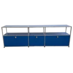 Shop authentic USM Haller 3×2 low media console in Gentian Blue with 3 drop-down doors, soft-open soft-close function, and timeless Swiss modular design.