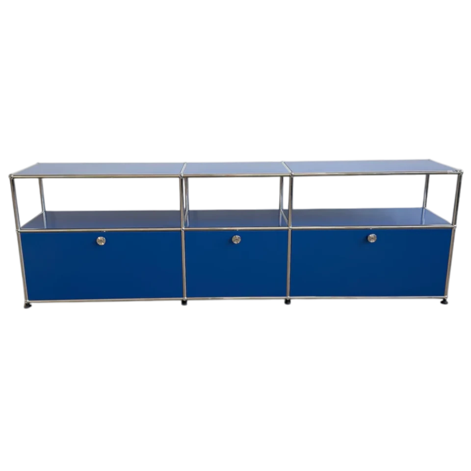 This authentic USM Haller 3×2 low media console in Gentian Blue is a sleek and highly functional example of modern Swiss design, combining the system’s iconic modular construction with clean architectural lines and exceptional everyday practicality. Finished in the rich and highly sought-after Gentian Blue colorway, this piece offers a bold yet refined presence that works beautifully in living rooms, media spaces, offices, and design-focused interiors.