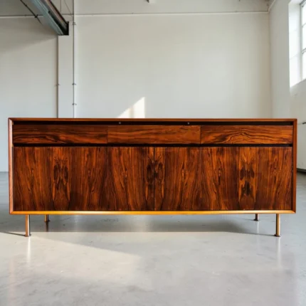 This sideboard is presented in exceptional vintage condition, with the highly figured Brazilian rosewood exhibiting the deep richness and three-dimensional grain that defines the finest examples of the species.