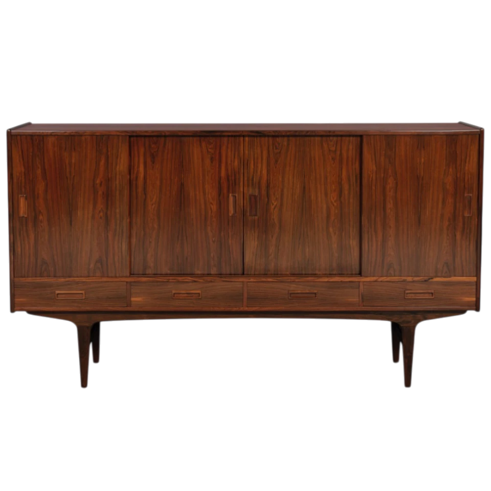 Børge Seindal for P. Westergaard Møbelfabrik: 1960s Danish Modern Brazilian rosewood sideboard. Four sliding doors, four drawers, mirrored internal bar section. Highly figured rosewood. 200 cm (78.7 in).