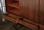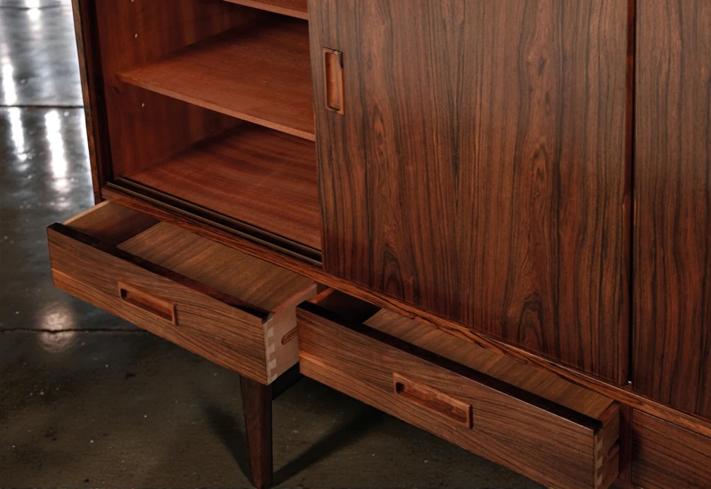 Four sliding doors glide effortlessly on recessed tracks, fitted with integrated sculpted pulls that maintain the clean, uninterrupted front facade. This configuration allows for flexible access to the interior while preserving the visual continuity of the highly figured rosewood. The doors feature bookmatched veneers that mirror the grain pattern across the facade—a hallmark of the highest level of craftsmanship.
