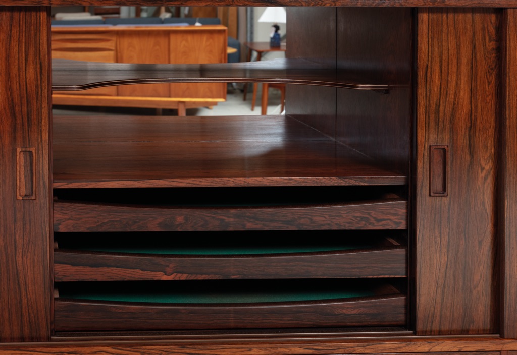 Børge Seindal’s design language is defined by clean lines, confident proportions, and an innate understanding of material expression. The tall, horizontal case—standing 114 cm high—creates a commanding, room-defining silhouette that elevates any interior. The unbroken expanse of highly figured rosewood across the facade draws the eye along the length of the piece, celebrating the wood’s extraordinary grain in uninterrupted splendor.