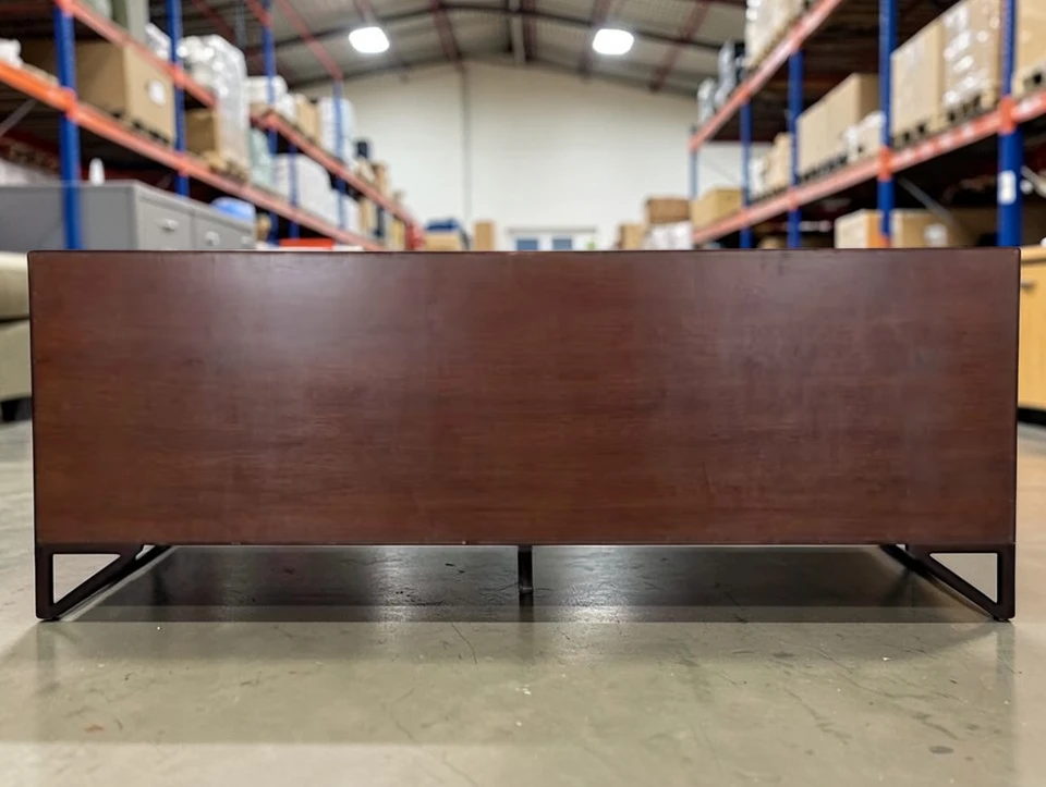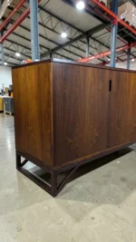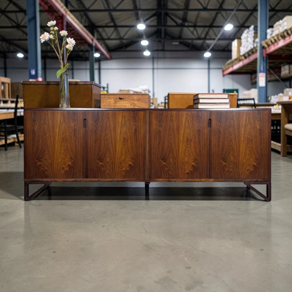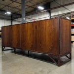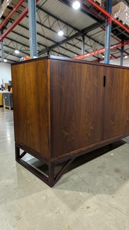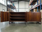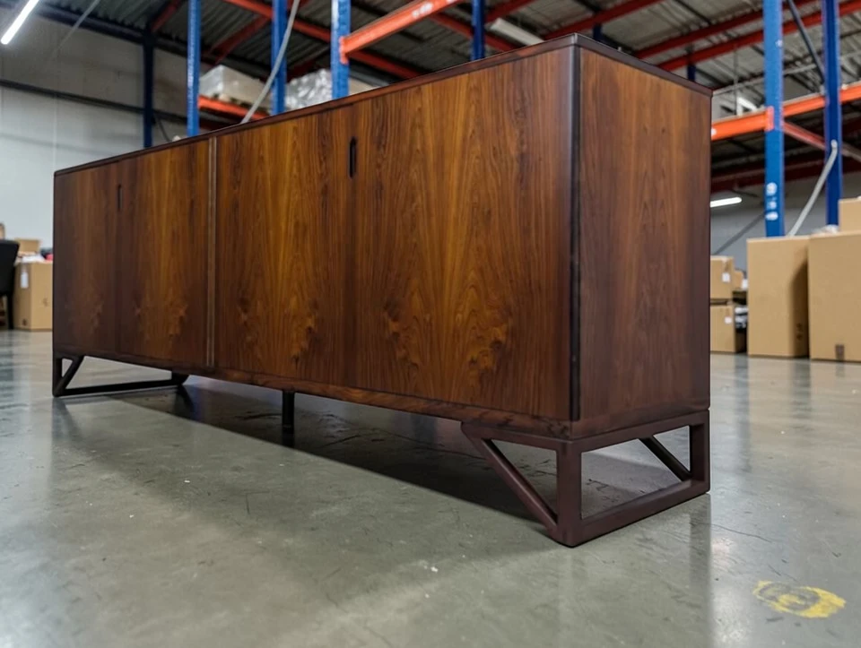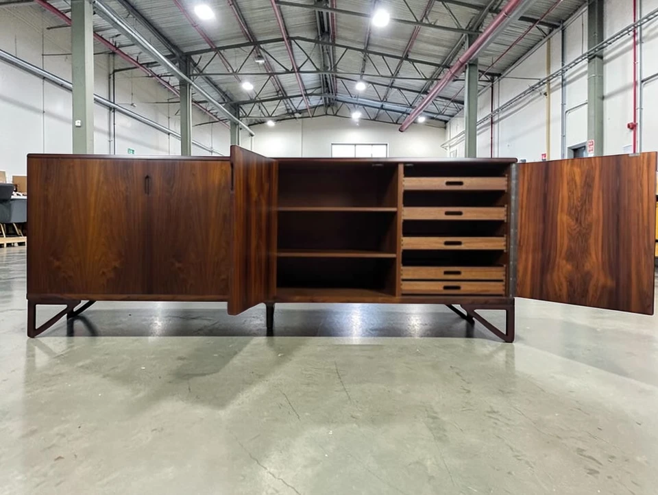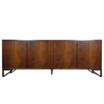 Exquisite Design & Functionality: Measuring an impressive 83 inches wide x 19.5 inches deep x 31.25 inches high, this cabinet commands presence while maintaining elegant proportions. It features four elegantly designed doors that glide open to reveal three distinct, spacious storage sections. The leftmost and middle sections are fitted with adjustable shelves, offering versatile organization for tableware, barware, media components, or books. The right section provides generous open storage, ideal for larger items. The seamless, minimalist facade with discreet finger-pulls or recessed hardware (specify which) creates a continuous, sculptural surface that highlights the dramatic figuring of the rosewood veneer.