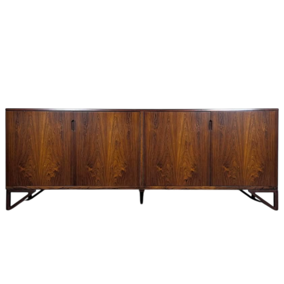 Danish Mid Century Rosewood Credenza by Svend Langkilde for Langkilde Møbler, c. 1960s. A rare and exceptional example of classic Scandinavian modern design, this magnificent rosewood sideboard has been meticulously refinished to near-excellent condition, showcasing the stunning natural grain of premium Brazilian rosewood, which radiates warmth and sophistication. Designed by the masterful Svend Langkilde and manufactured by Langkilde Møbler in Denmark, this credenza epitomizes the clean lines, functional beauty, and superior craftsmanship of 1960s Danish Modern furniture.