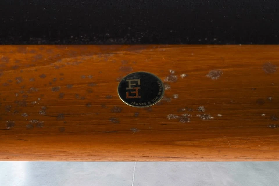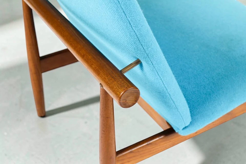 Crafted from solid teak, the chairs exhibit a warm, rich patina that speaks to the timeless appeal and enduring quality of Scandinavian design. The structure is inspired by traditional Japanese joinery, resulting in an elegant silhouette that is both refined and functional. The architectural frame features soft curves, subtly tapered legs, and floating backrests—showcasing Juhl’s masterful understanding of form, proportion, and visual lightness.