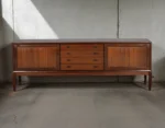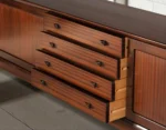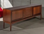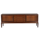 This exceptional sideboard was designed by H.W. Klein and crafted by Bramin Møbler in Denmark during the 1960s. A masterwork of Scandinavian Modern design, this piece showcases Klein’s mastery of proportion, balance, and restraint—where rich materials, meticulous craftsmanship, and thoughtful functionality converge.