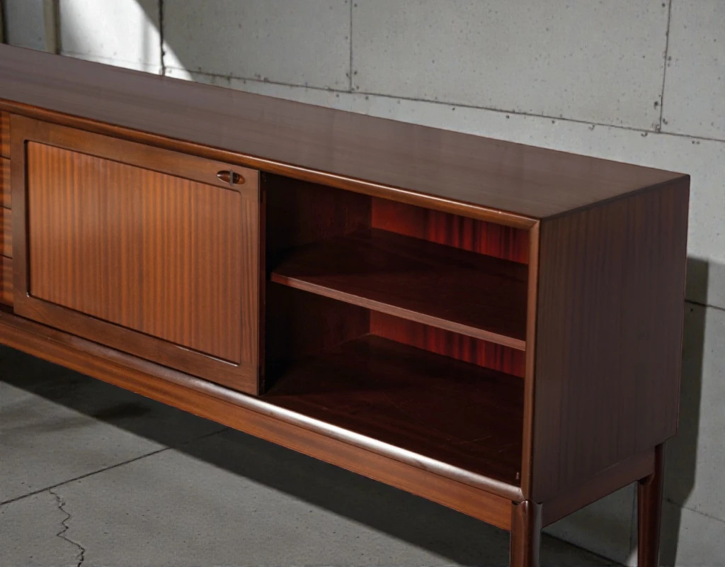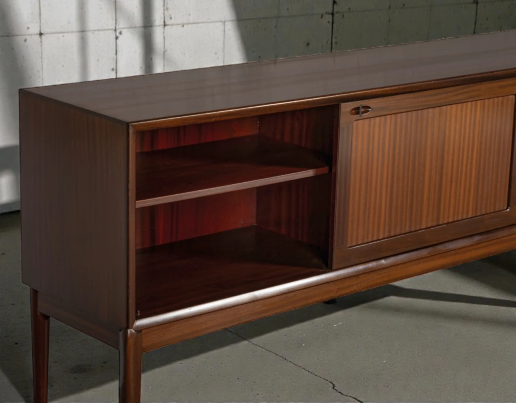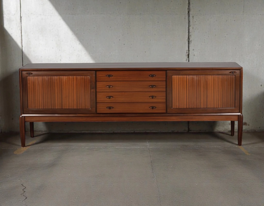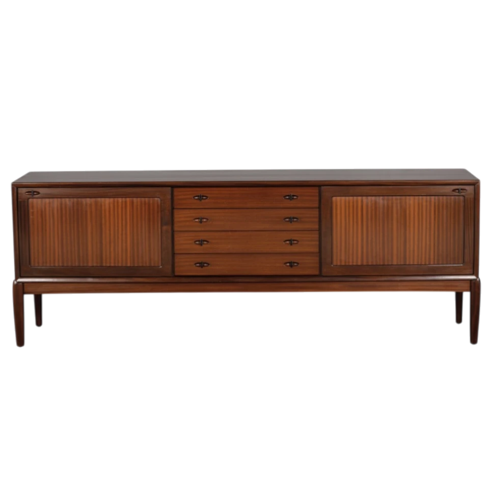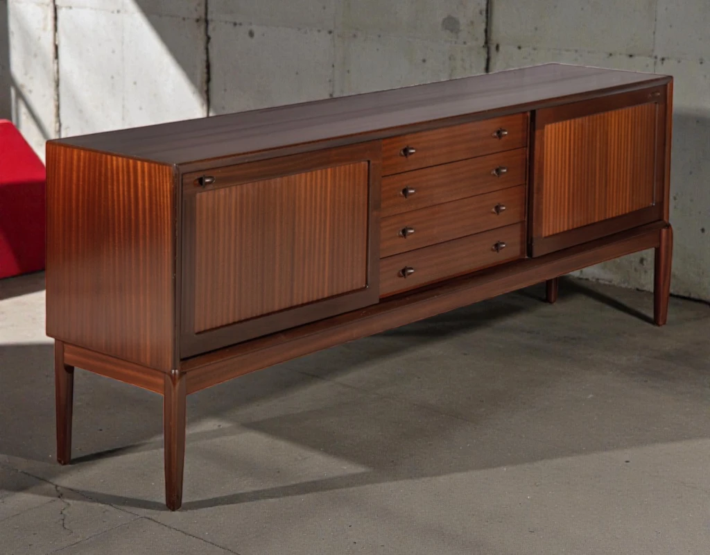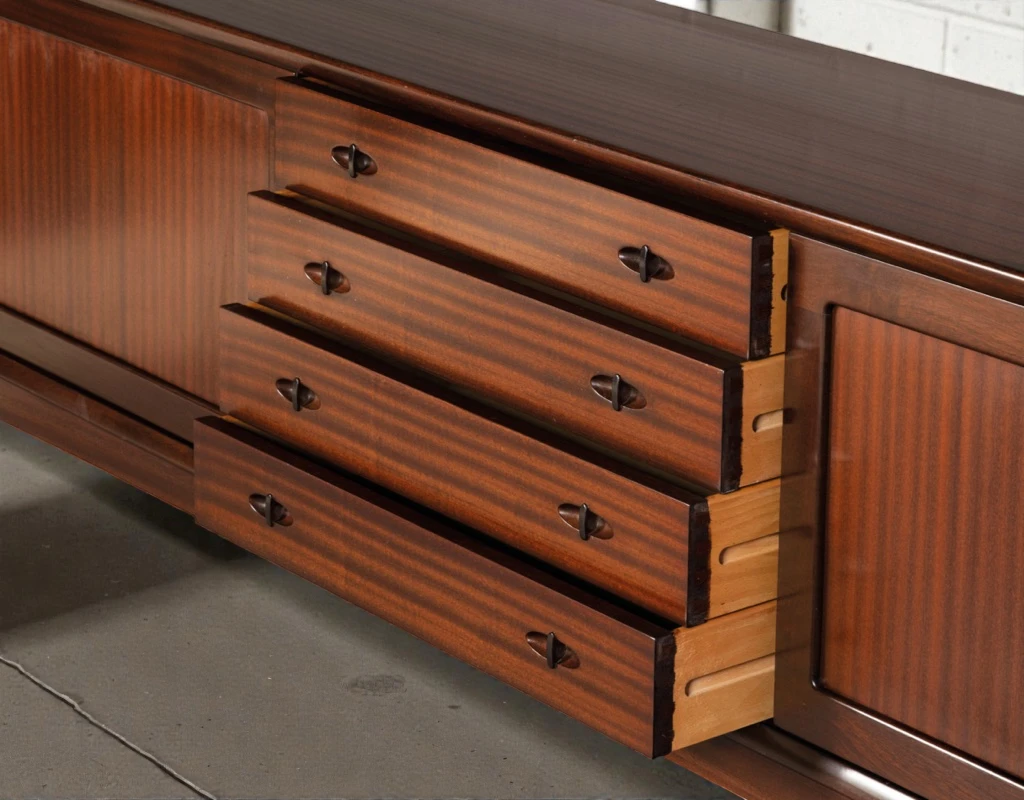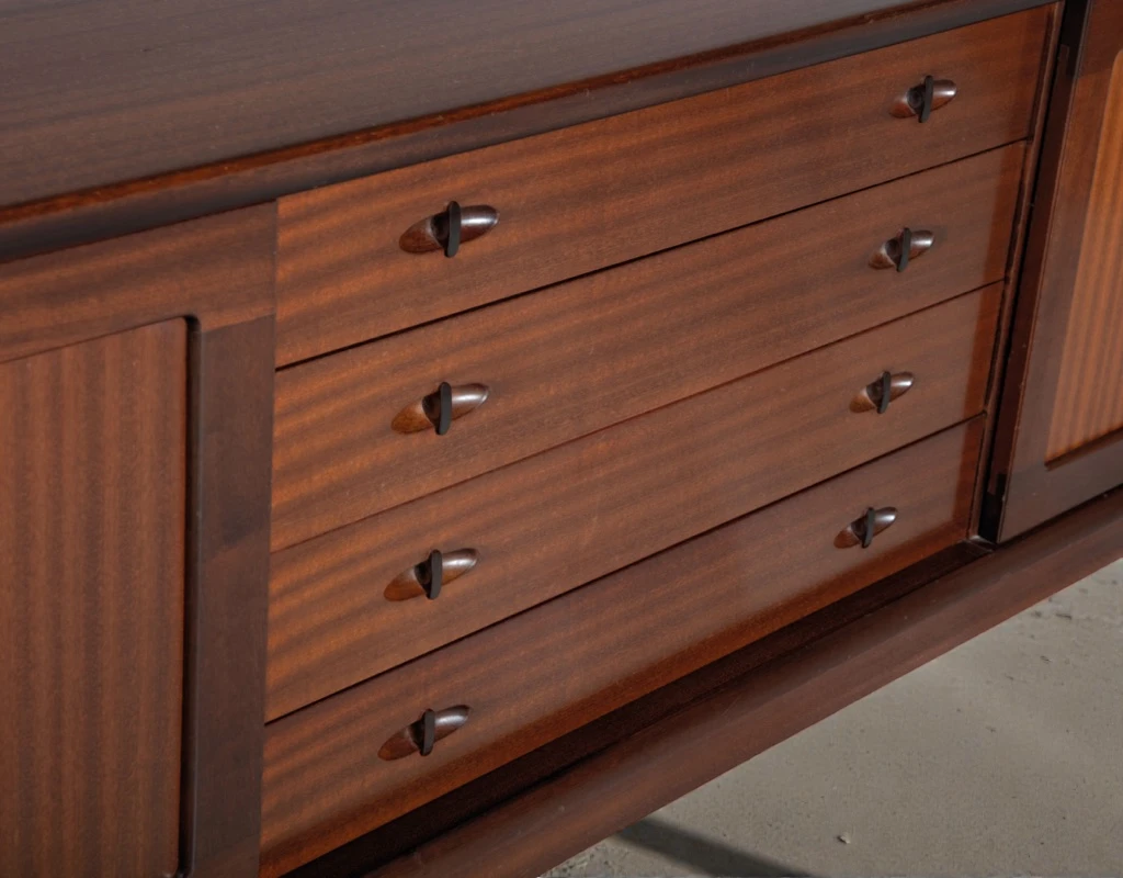 Executed in richly grained mahogany, this sideboard features beautifully matched veneers that create a warm, sophisticated presence. The wood’s deep, mature tones are preserved with an authentic patina that adds character and depth.