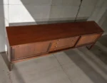 H.W. Klein’s design language is defined by clean lines, thoughtful proportions, and an innate understanding of material expression. The long, horizontal case—measuring 225 cm—creates a commanding presence while maintaining the elegant, elevated silhouette that defines Danish Modern design. The piece is elevated on tapered, raised legs, lending visual lightness to the substantial form.