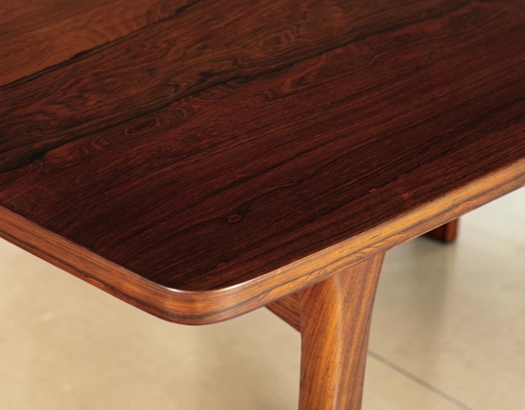 The table is crafted from Brazilian rosewood, the most coveted wood in Danish Modern furniture. Prized for its deep, rich coloration – ranging from chocolate brown to burgundy with striking black figuring – and expressive natural grain patterns. The warm tonal variation and figuring make each table unique.