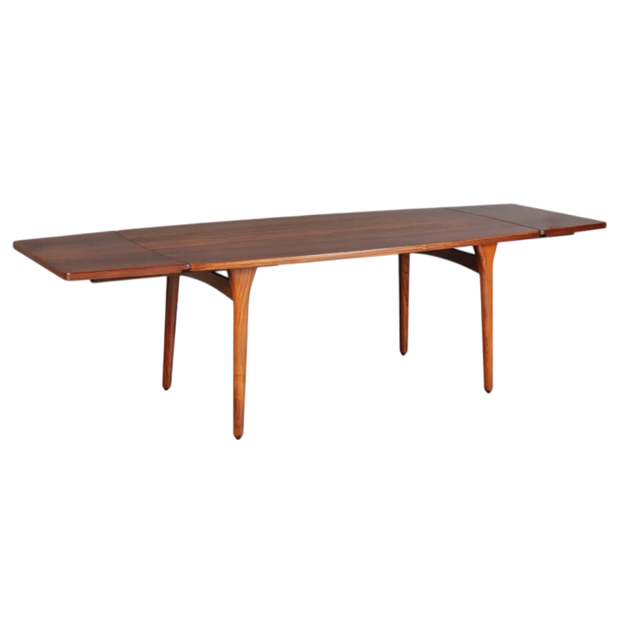 Henning Kjærnulf was a Danish furniture designer known for his organic, sculptural forms and masterful use of fine woods. His designs often feature tapered profiles, flowing lines, and a balance of strength and visual softness – all evident in this extension dining table.