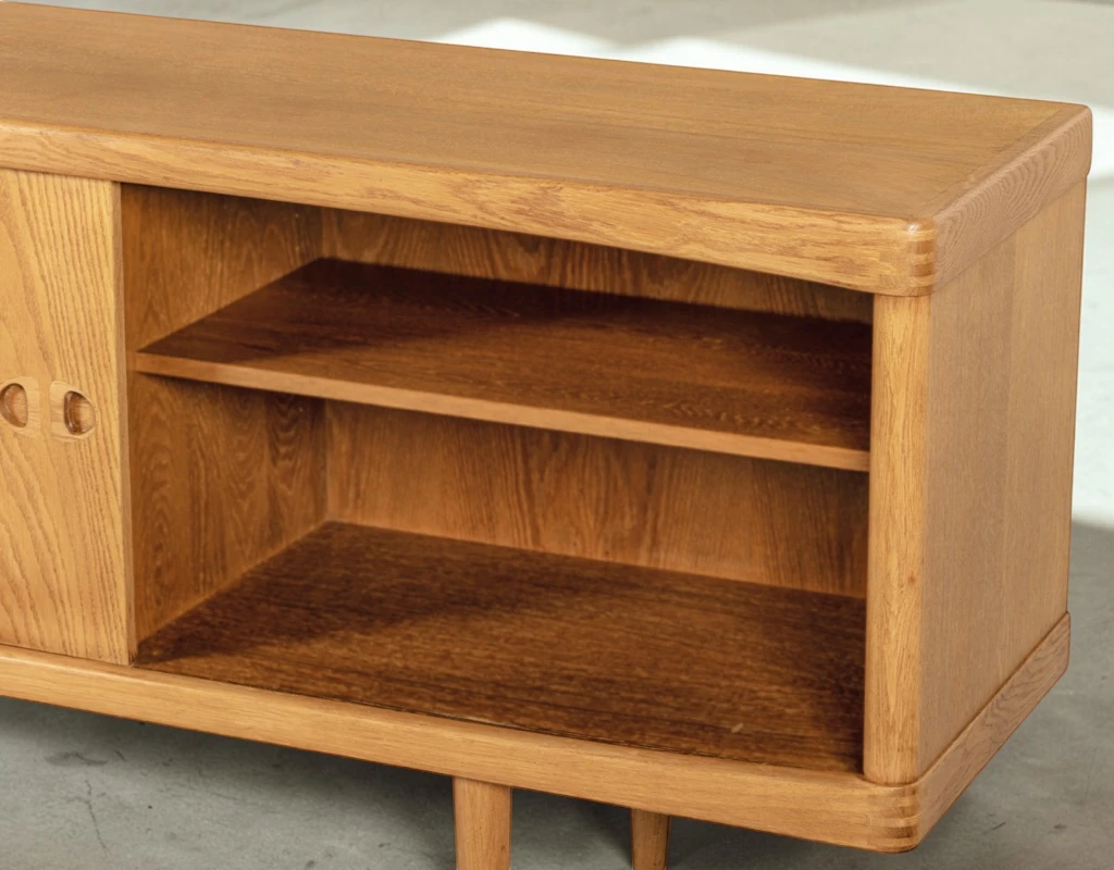 Two sliding doors glide smoothly to reveal adjustable shelving, offering flexible storage for media, dinnerware, or collectibles. Four central graduated drawers—constructed with dovetail joinery—provide organized space for smaller essentials.