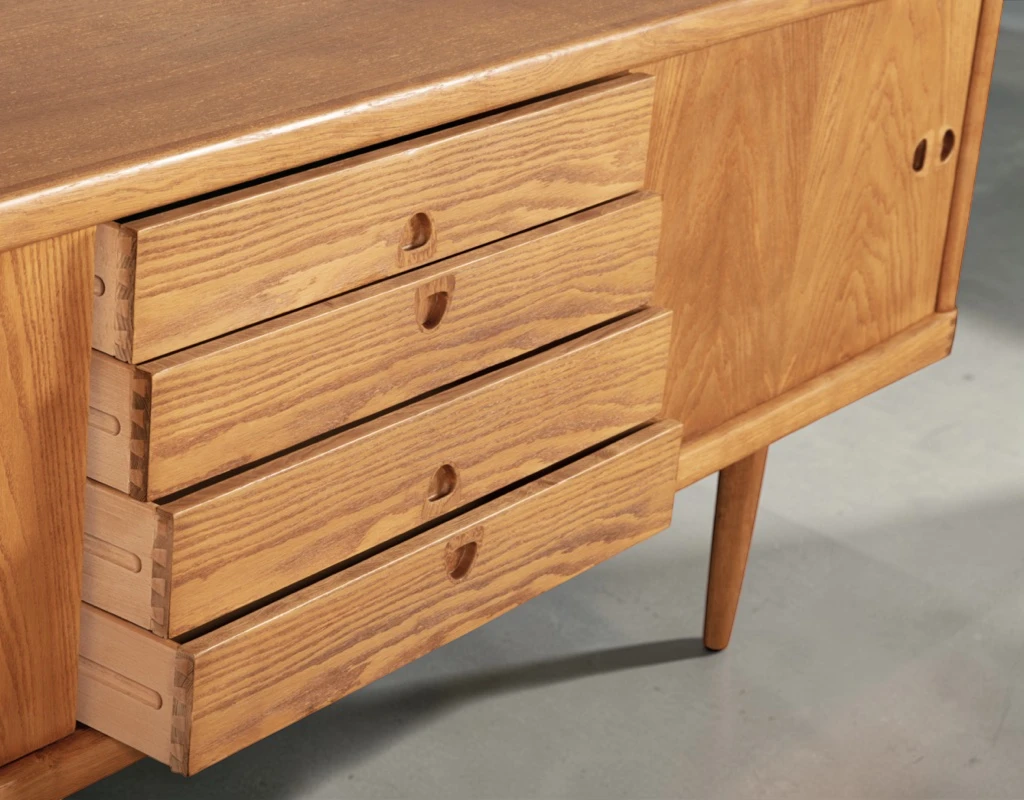 Klein’s design language is defined by organic curves and honest construction. The case features exposed finger-joint detailing at the corners—a signature motif that celebrates the craftsmanship within. The long, clean lines are softened by subtly rounded edges, while the floating top and tapered legs elevate the profile with characteristic Danish lightness.