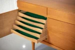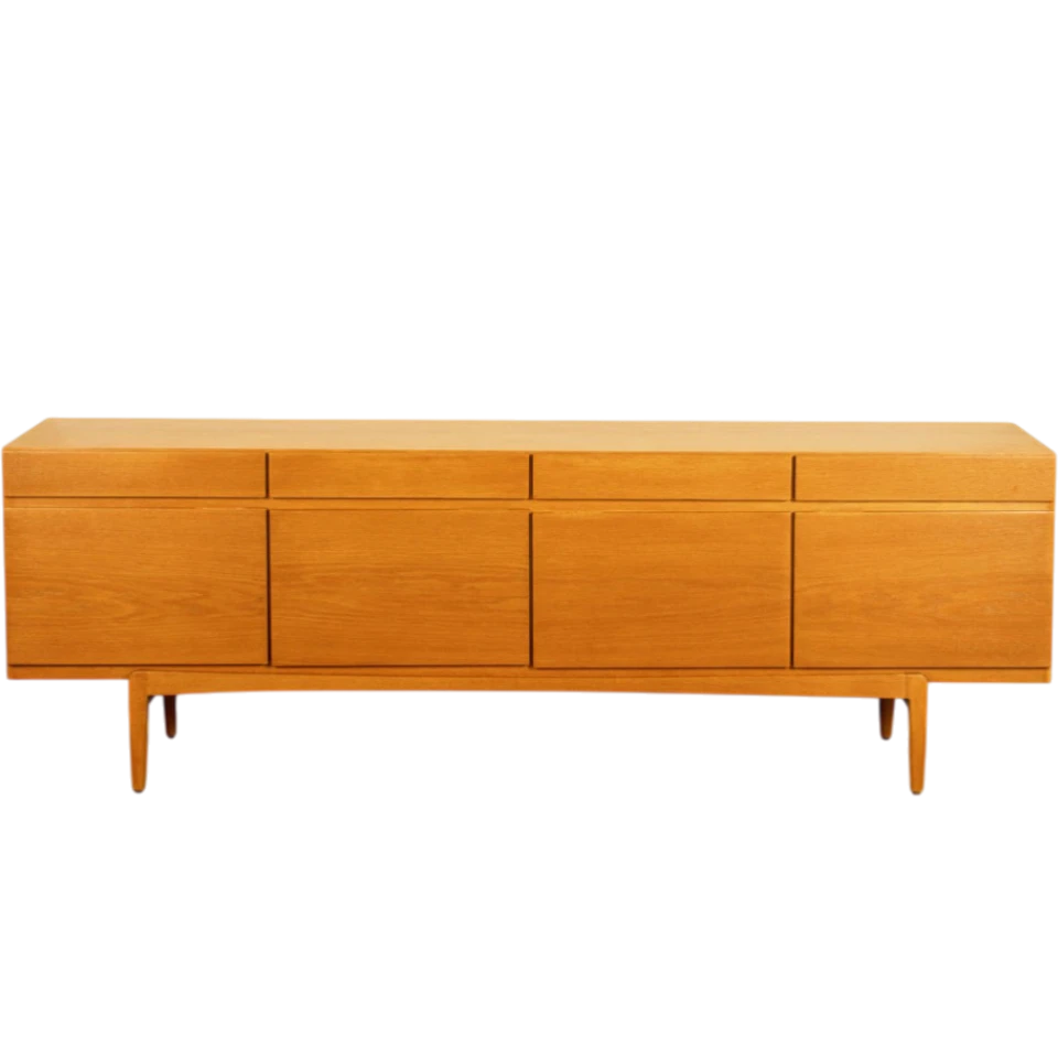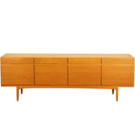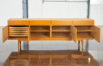 The Model 66 exemplifies Kofod-Larsen’s mastery of proportion. The long, horizontal case is elevated on tapered, raised legs, lending visual lightness to the substantial form. The four sliding doors feature sculpted recessed pulls—an integrated design element that maintains the clean, uninterrupted facade while providing effortless operation .