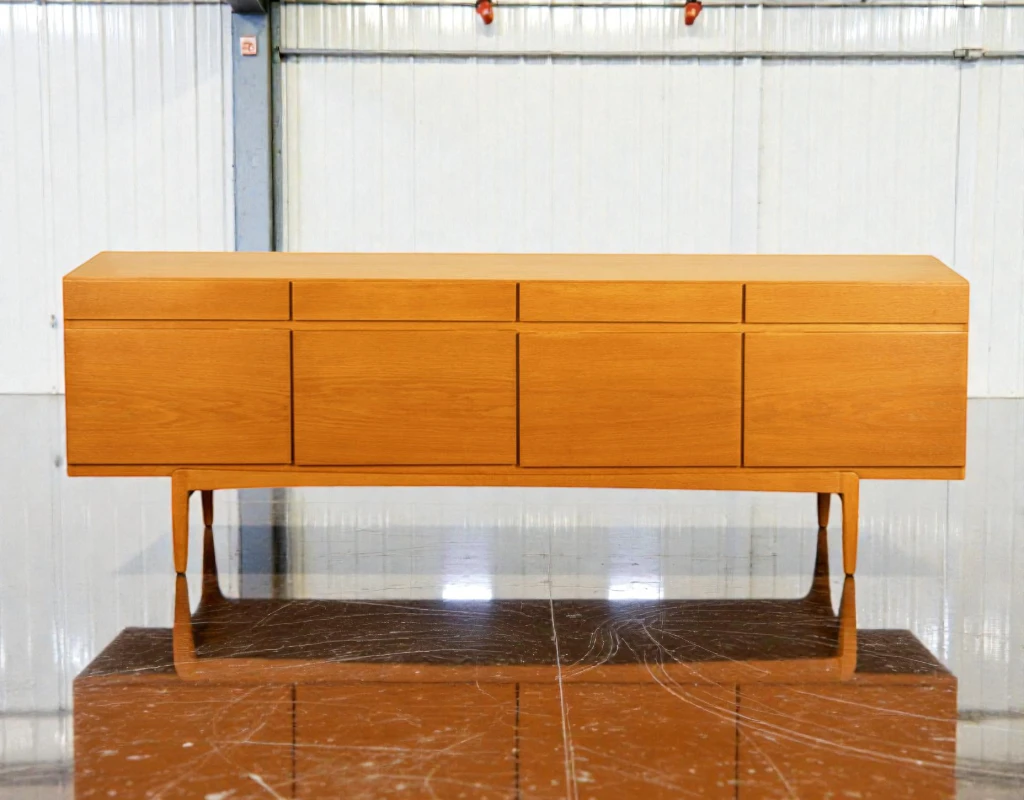 Executed in warm Danish oak, the sideboard has been finished with a superior hand French polish, a traditional technique that enhances the wood’s natural grain with a deep, luminous luster. The result is a surface of exceptional depth and warmth, showcasing the oak’s rich tonal variation and the seamless bookmatching across the four doors.
