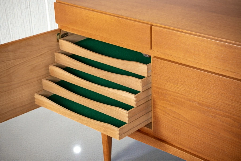 Above the door line, four graduated drawers run the full width of the piece. Constructed with traditional dovetail joinery, they offer organized storage for flatware, linens, or personal effects. The drawer fronts continue the bookmatched grain pattern across the facade—a hallmark of Kofod-Larsen’s attention to material continuity .