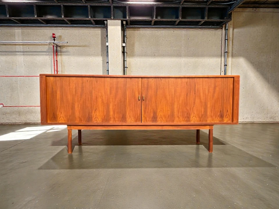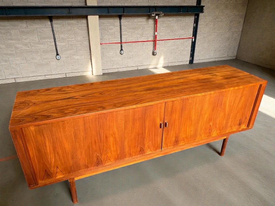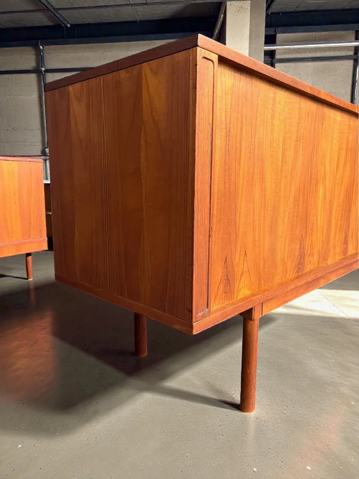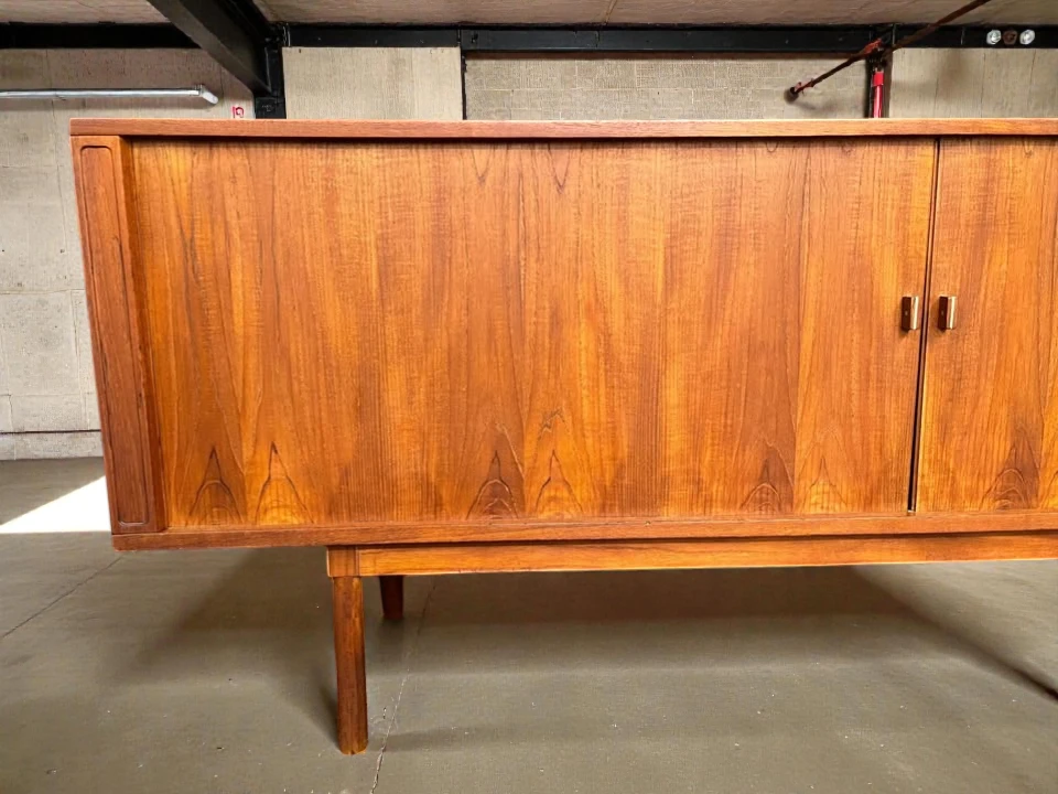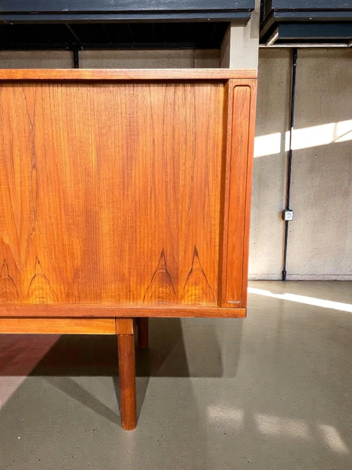 Crafted from richly grained teak wood, this credenza features beautifully curved tambour doors that glide seamlessly into the back of the cabinet, revealing ample interior storage. The wooden sliding doors eliminate the need for extra space when opened, making it perfect for both spacious and compact environments. The craftsmanship is outstanding, with smooth joinery, precision detailing, and a warm, lustrous finish that speaks to the quality of Danish woodworking from this era.
