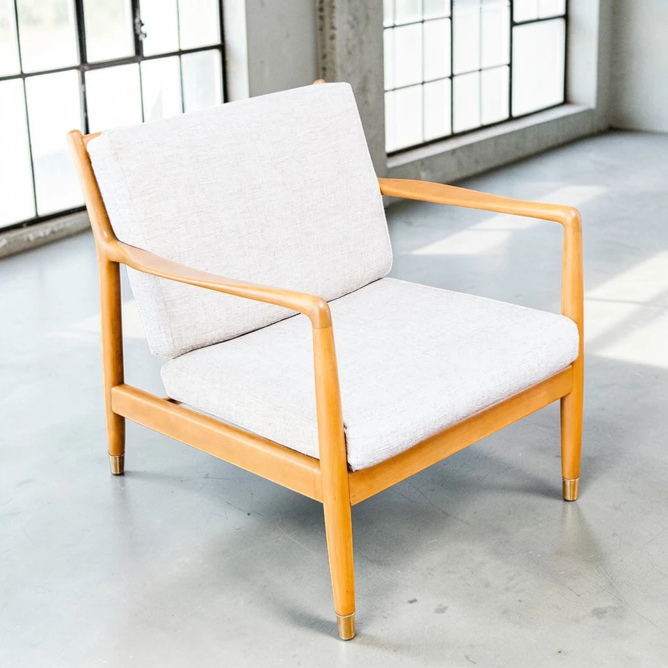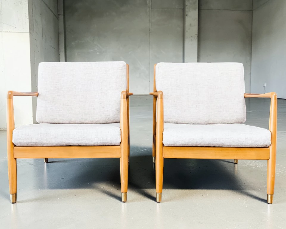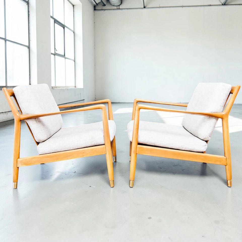Shop this rare pair of 1960s Danish lounge chairs by Folke Ohlsson for DUX – restored beechwood frames, brass leg caps, and iconic mid-century style.
