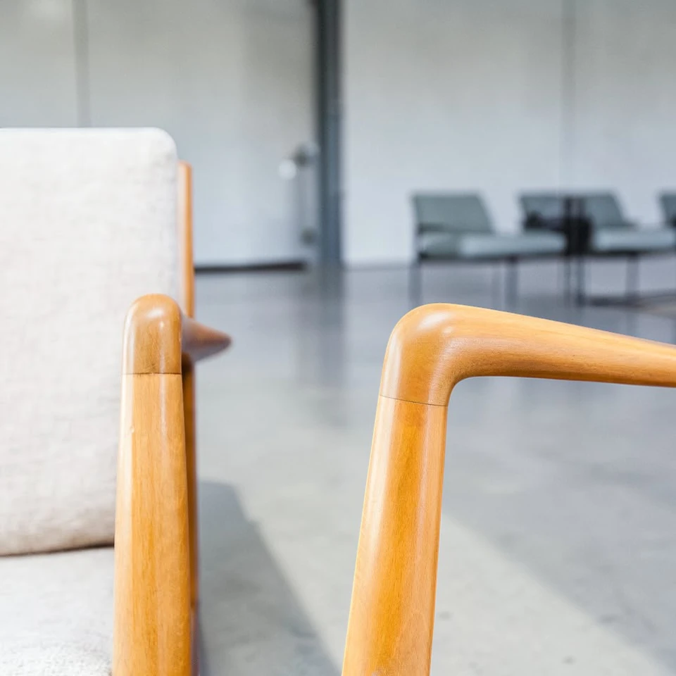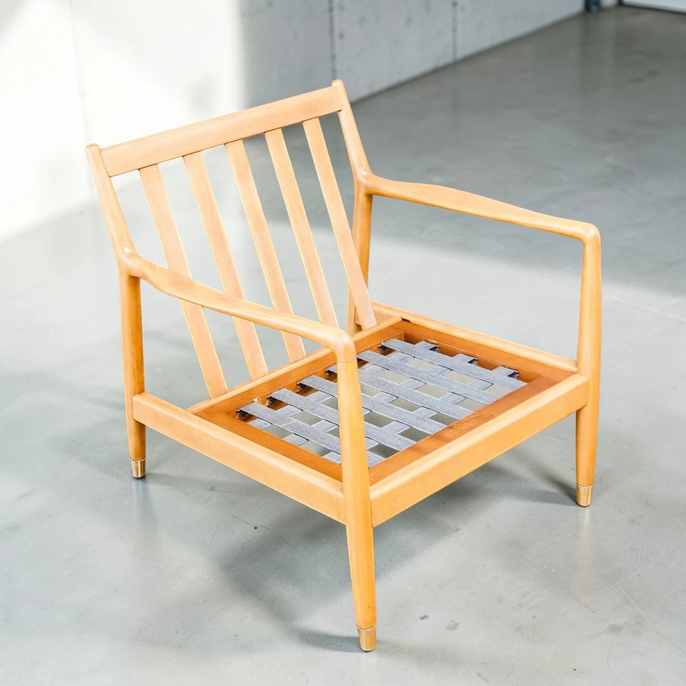 The chairs have been fully restored, with their solid beechwood frames meticulously cleaned, sanded, and finished without stain to enhance the natural golden hue of the wood. The brass caps have been polished to showroom condition, and the original cushions, webbing, and fabric remain in excellent condition—firm, supportive, and ready for decades of continued use.
