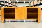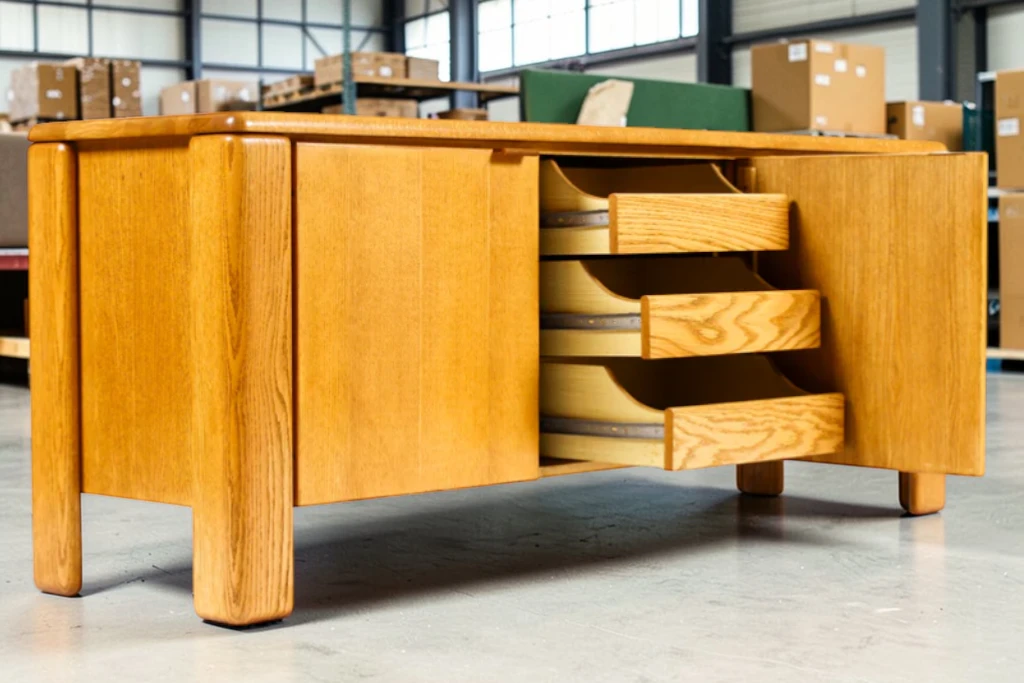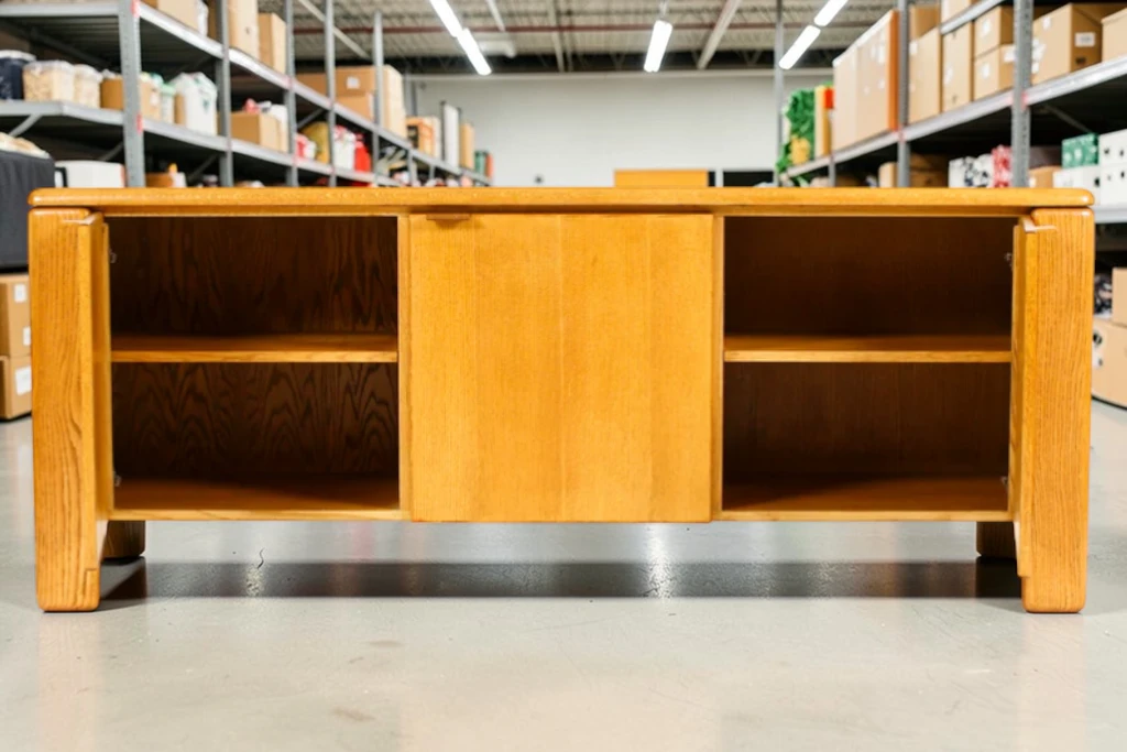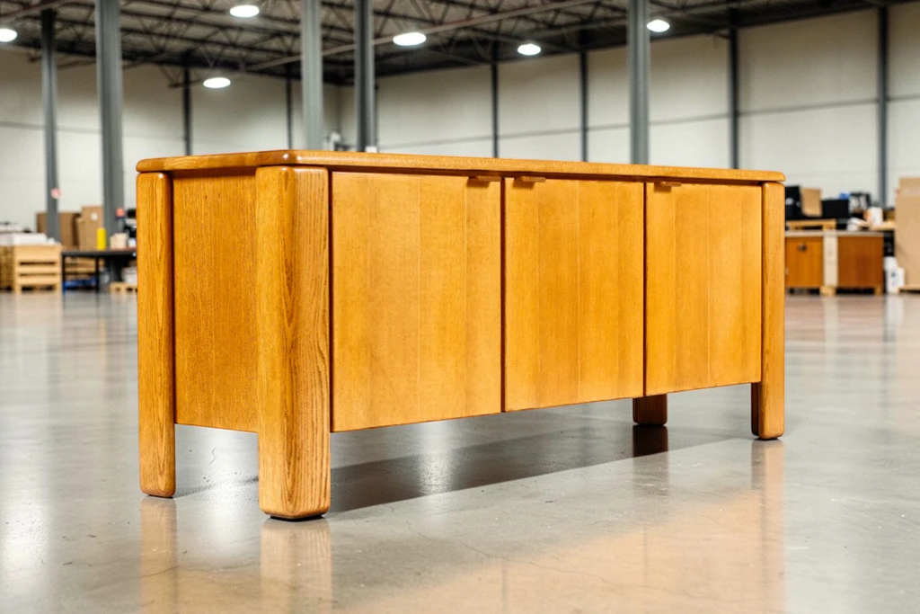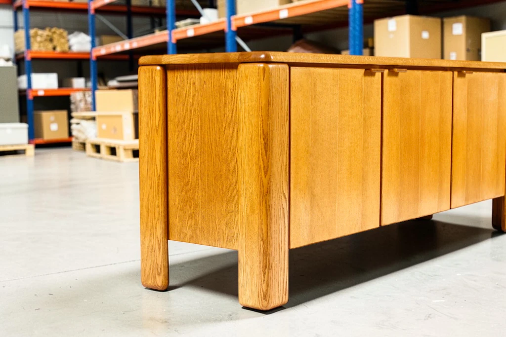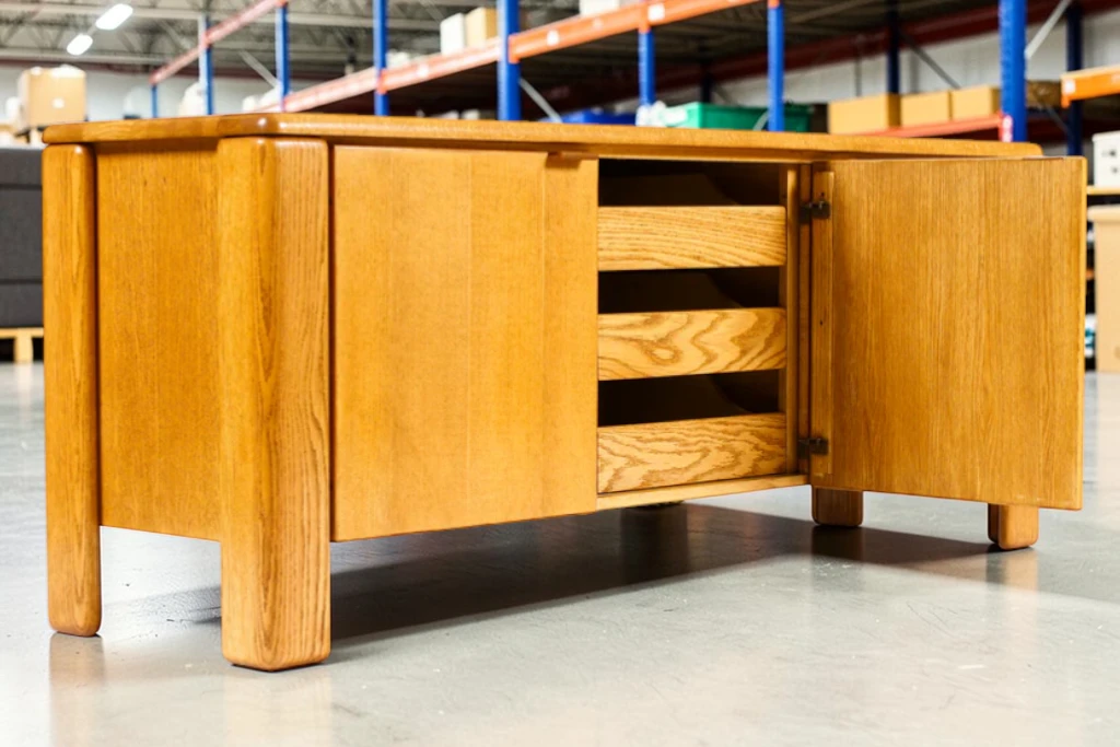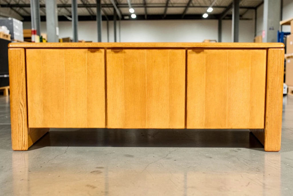 Crafted from solid white oak, the sideboard features a visually striking “chunky” profile with rich grain detailing throughout. The piece offers generous storage with removable shelves behind cabinet doors and a center section with three smoothly gliding drawers, making it both functional and stylish for living rooms, dining areas, or office settings.