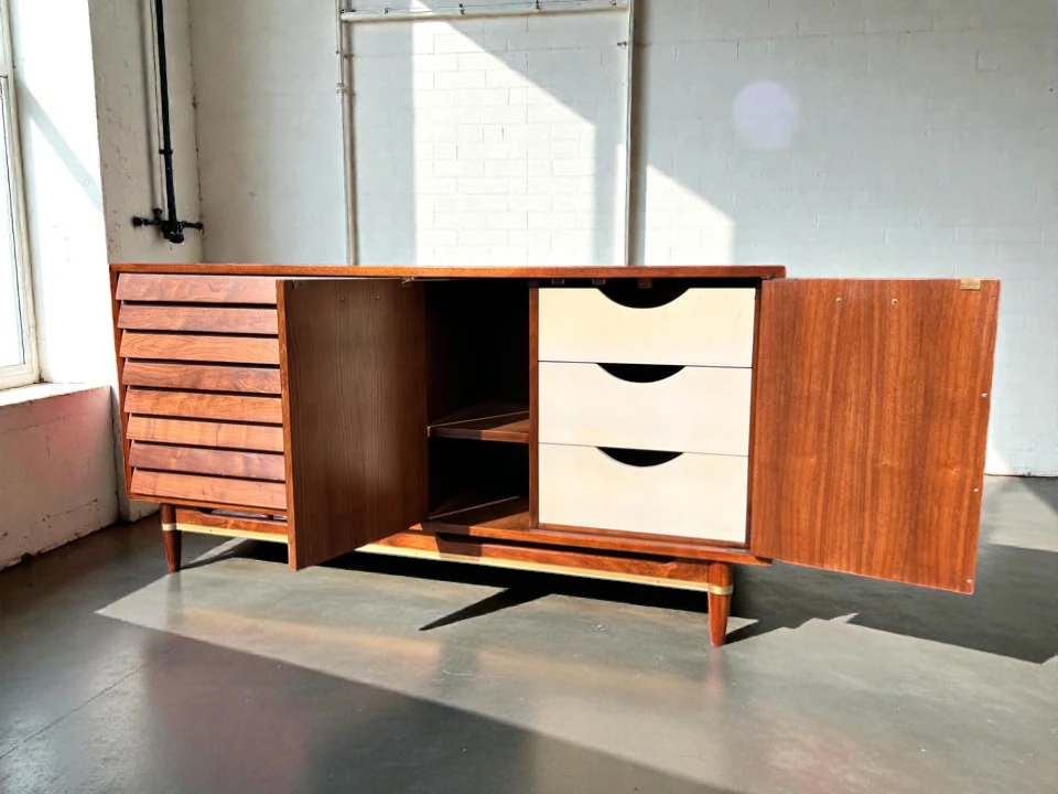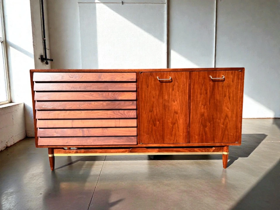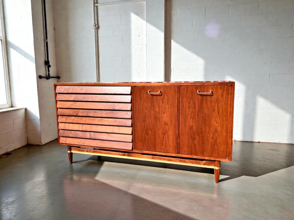 This American of Martinsville credenza represents the finest in mid-century craftsmanship and design, making it a must-have for collectors and MCM enthusiasts. Whether used in a dining room, living space, or office, its sleek lines and timeless appeal will elevate any interior.