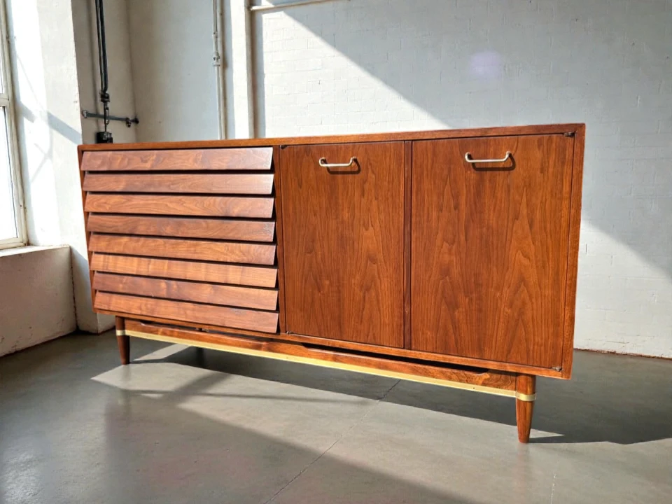 Upgrade your space with this rare Mid-Century Modern American of Martinsville Dania Walnut Credenza. Featuring premium walnut veneer, brass accents, signature louvered drawer pulls, and a solid stretcher base. Perfect as a sideboard, buffet, or media console. A true statement piece of vintage MCM design.