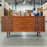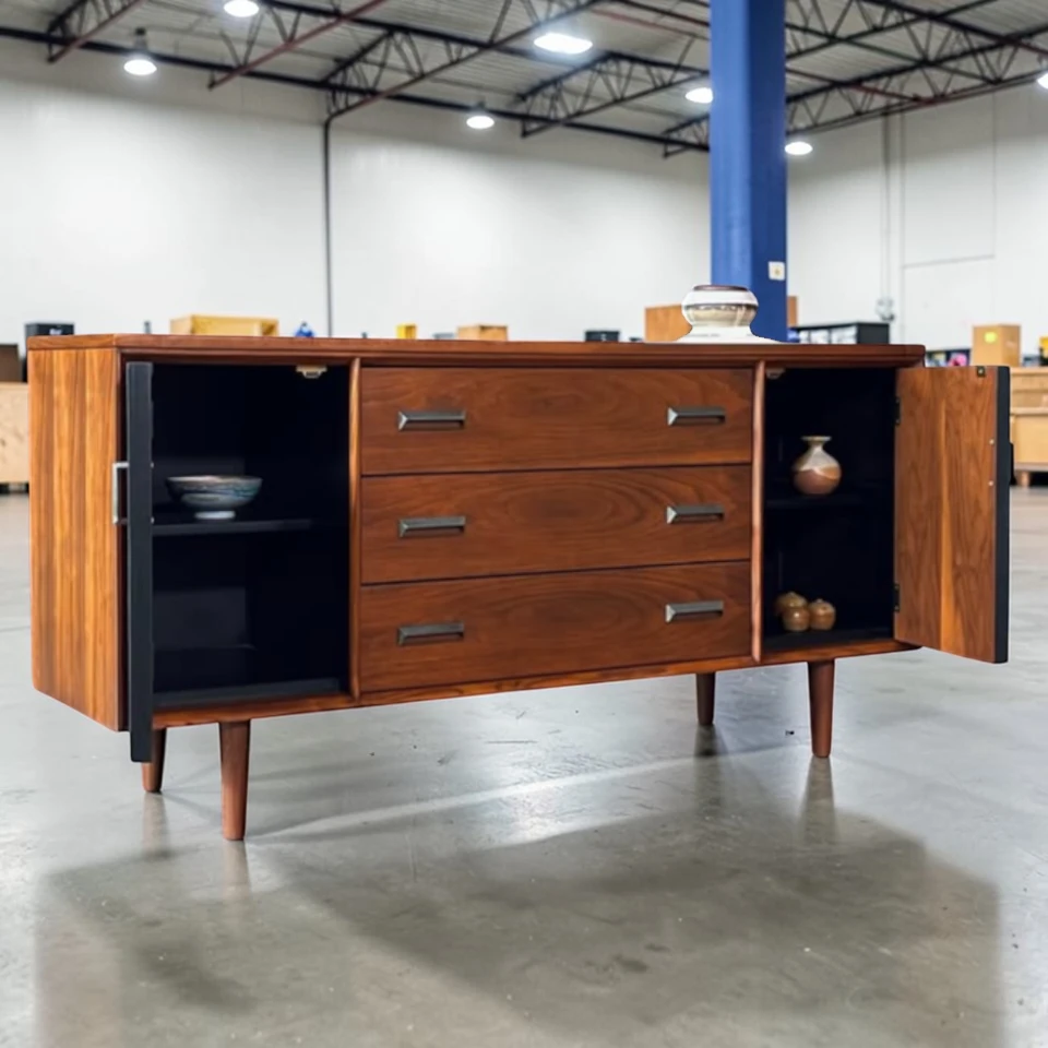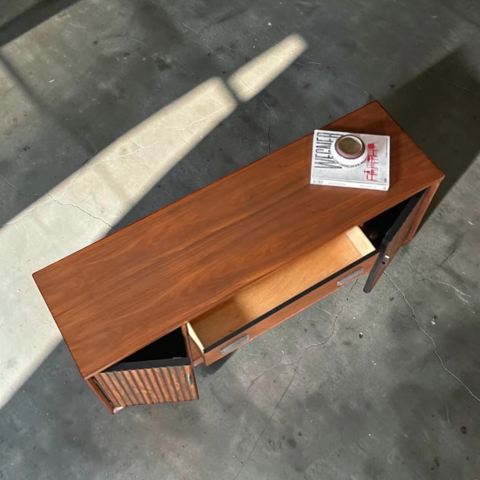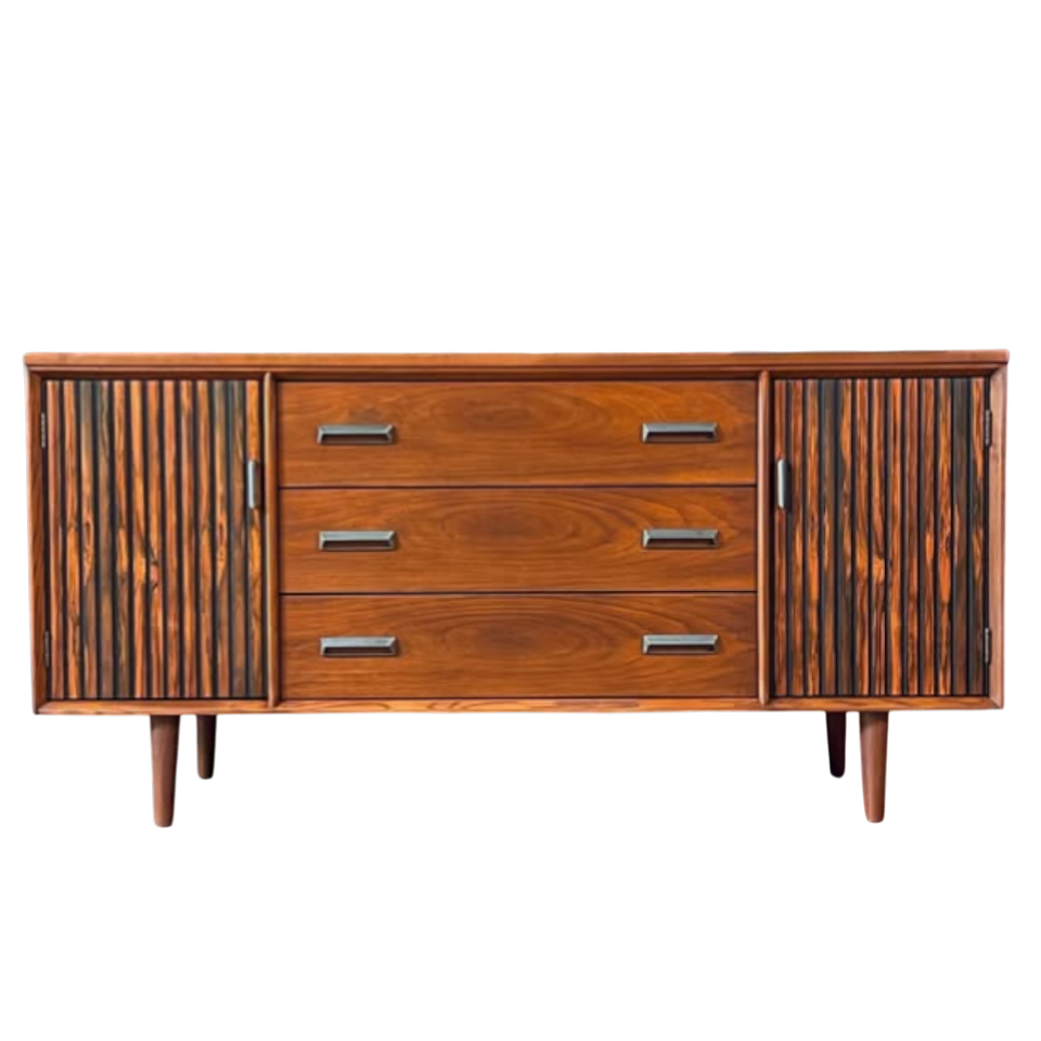 Unlike mass-produced modern furniture, this 1960s Bassett credenza offers real wood veneers in patterns that are no longer available (due to CITES restrictions on Rosewood). It is a sustainable choice—upcycling vintage furniture reduces waste while adding immediate character to your home.
