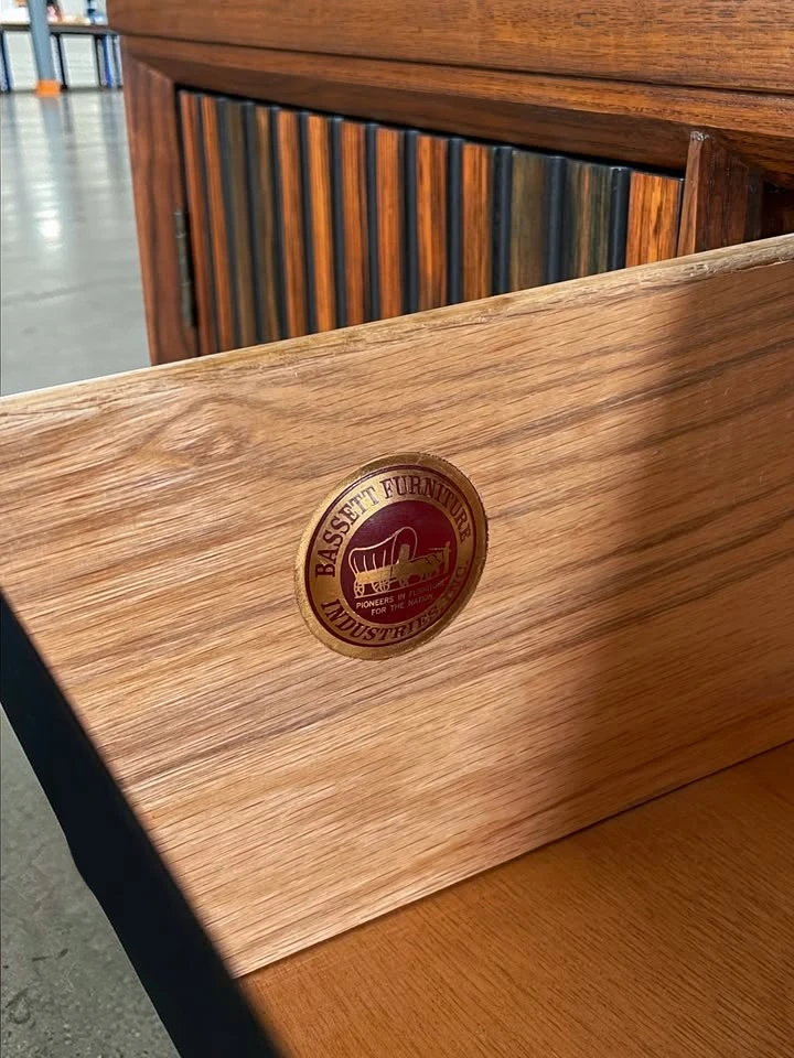 Bassett Furniture Industries has been a pillar of American furniture manufacturing since 1902. During the 1960s, Bassett produced high-end modern lines that rivaled the big names of the era, utilizing old-world joinery techniques combined with machine-age efficiency. This credenza represents the pinnacle of their vintage output.