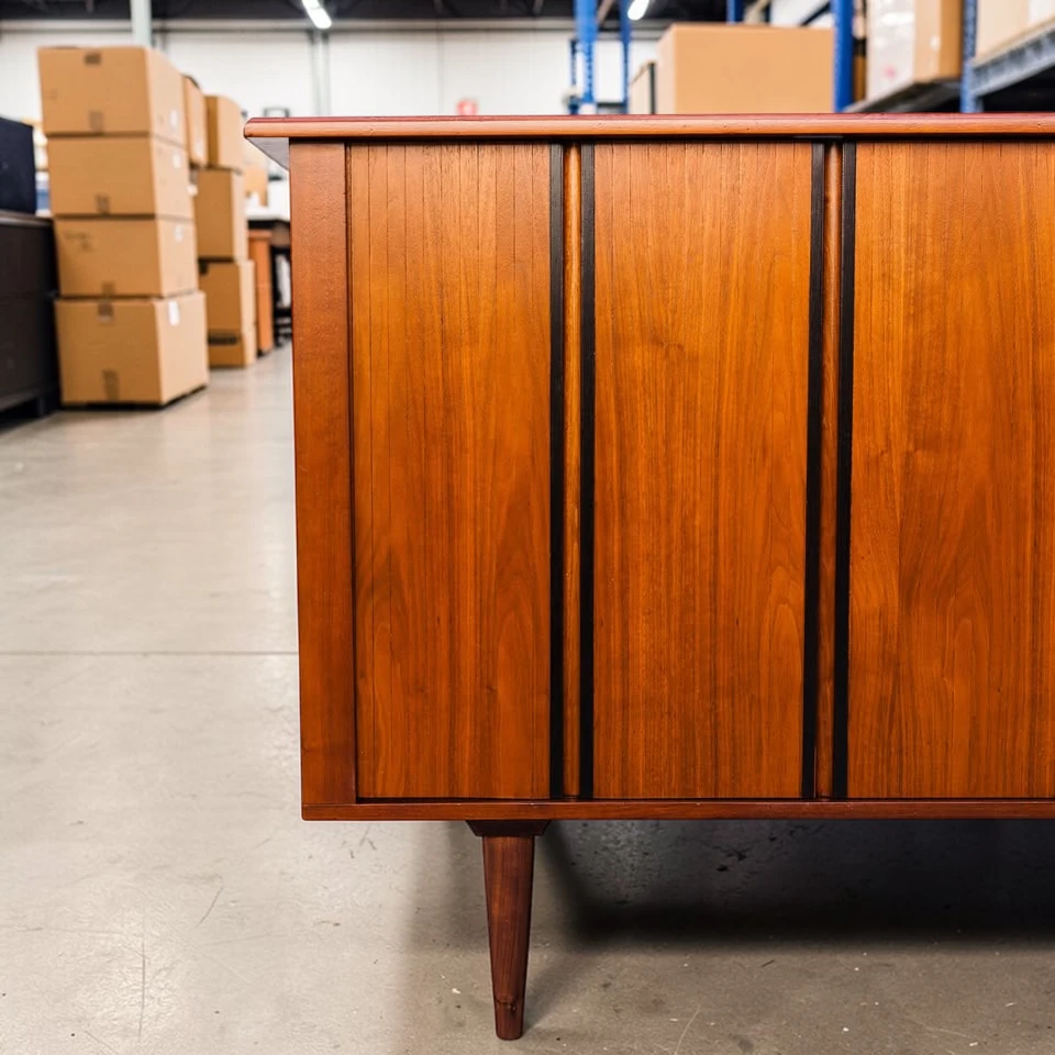 The credenza’s top is finished with a subtly notched edge, with the walnut grain flowing seamlessly across the surface and cascading down each side—showcasing the natural beauty of the wood. The entire case is elevated by tapered walnut legs, giving the piece a light, floating appearance while remaining grounded in classic mid-century design.
