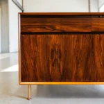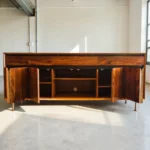 The top and sides of the sideboard feature warm, subtle walnut veneer, adding a sense of depth and richness to the piece, while the bookmatched rosewood front showcases wild, striking grain patterns that are as unique as they are beautiful. The madison design exudes a sense of balance, making this sideboard the perfect anchor for any mid-century or modern decor.
