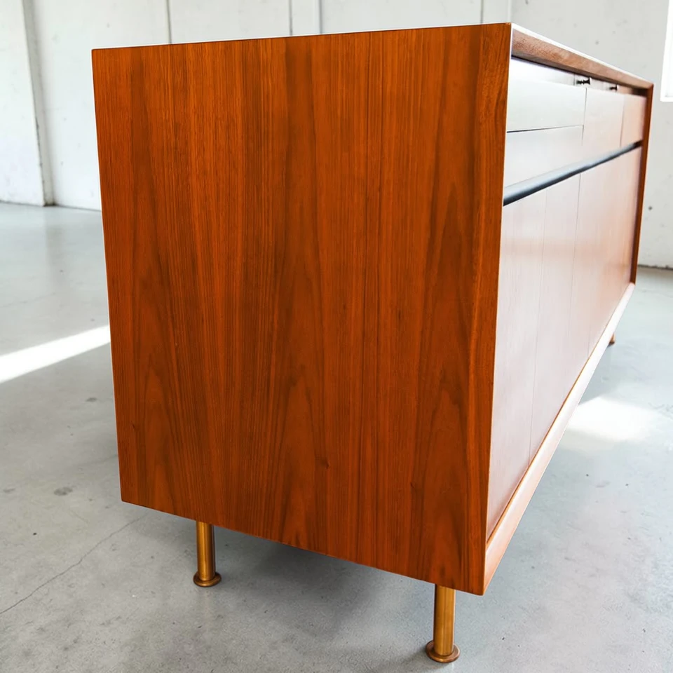 This sideboard is perfectly at home among both Mid Century Modern and Danish Modern decor, offering a stunning combination of vintage elegance and functional beauty. The piece has been refinished inside and out, preserving its incredible charm while ensuring that it is in excellent condition, with only subtle traces of its age remaining.