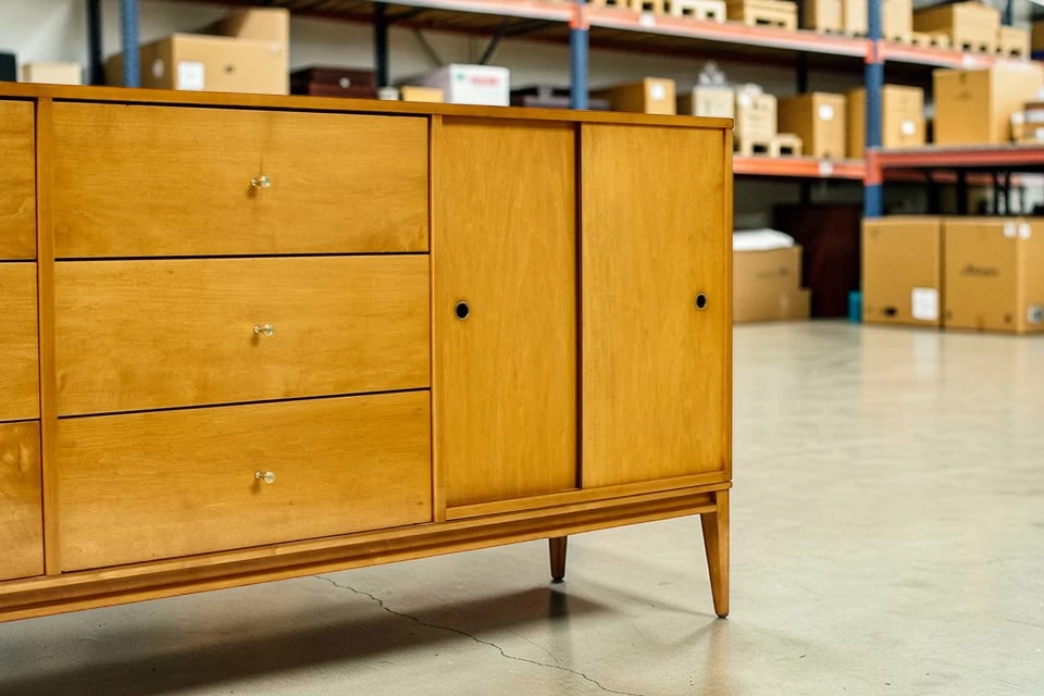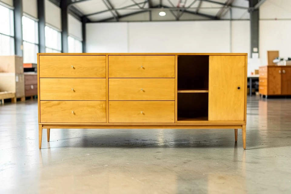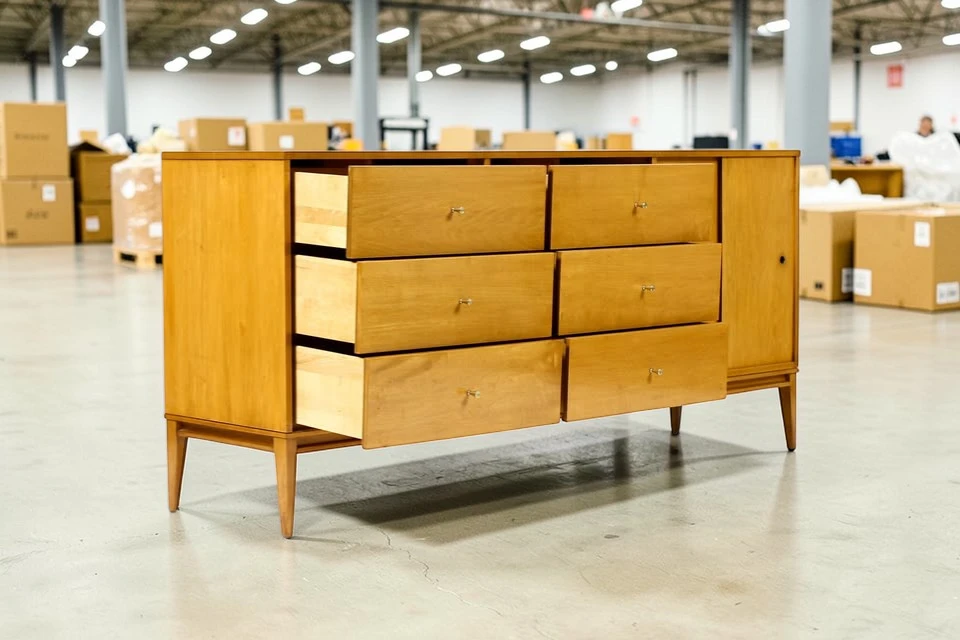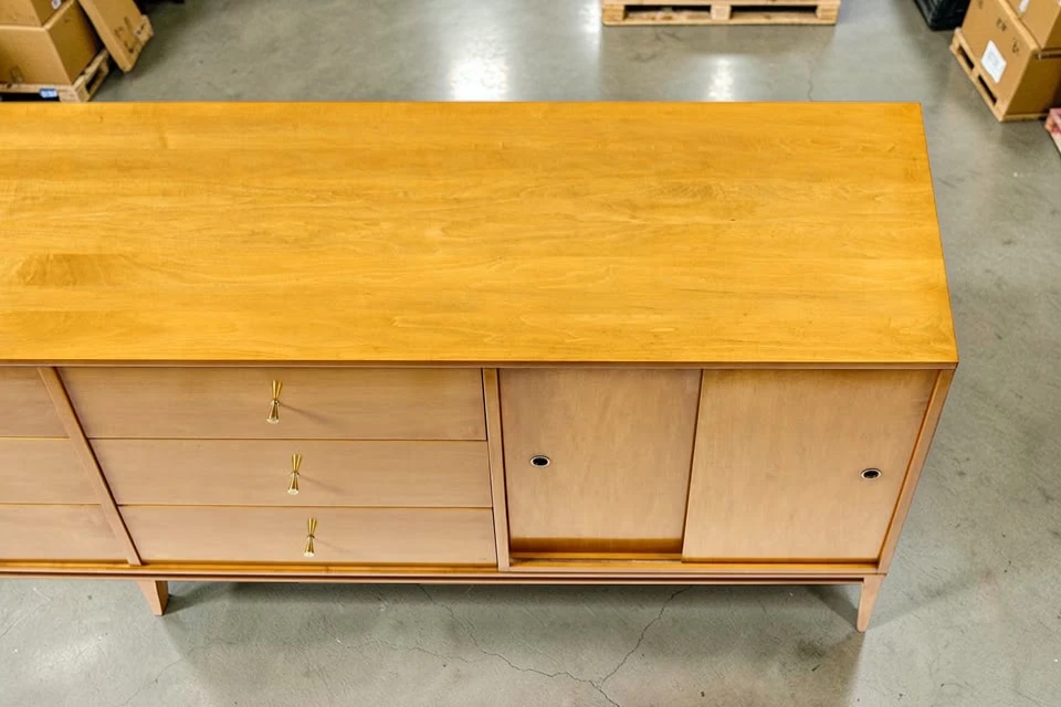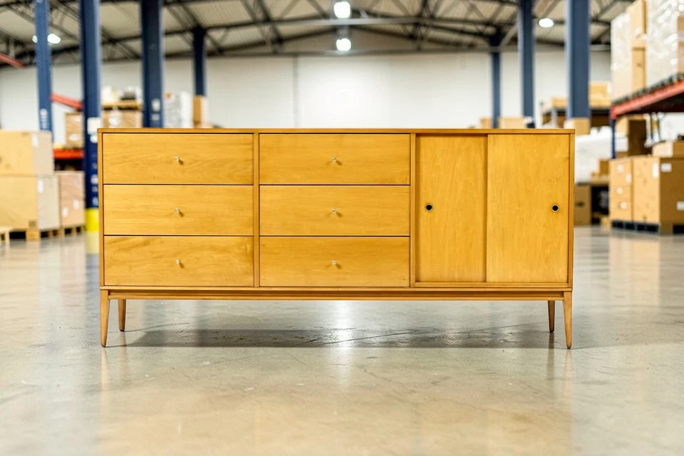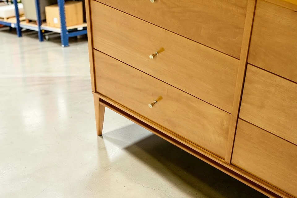 The dresser is crafted from solid hard maple – a durable, beautiful wood with a subtle, warm grain. Unlike veneered pieces, solid maple construction ensures longevity and the ability to be refinished if desired. The wood has a clean, light appearance that works beautifully in both traditional mid-century and contemporary interiors.