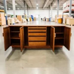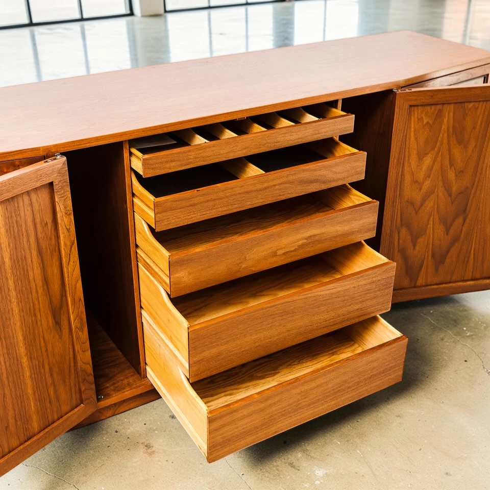 This piece is not only a visual delight but also offers practical storage solutions. The left and right sides of the credenza feature adjustable shelves, providing flexible storage for books, décor, or other essentials. The center section contains five dovetailed drawers, two of which are felt-lined to protect delicate items. Additionally, the credenza has vertical storage compartments, making it ideal for organizing and storing a variety of items in a stylish and accessible manner.