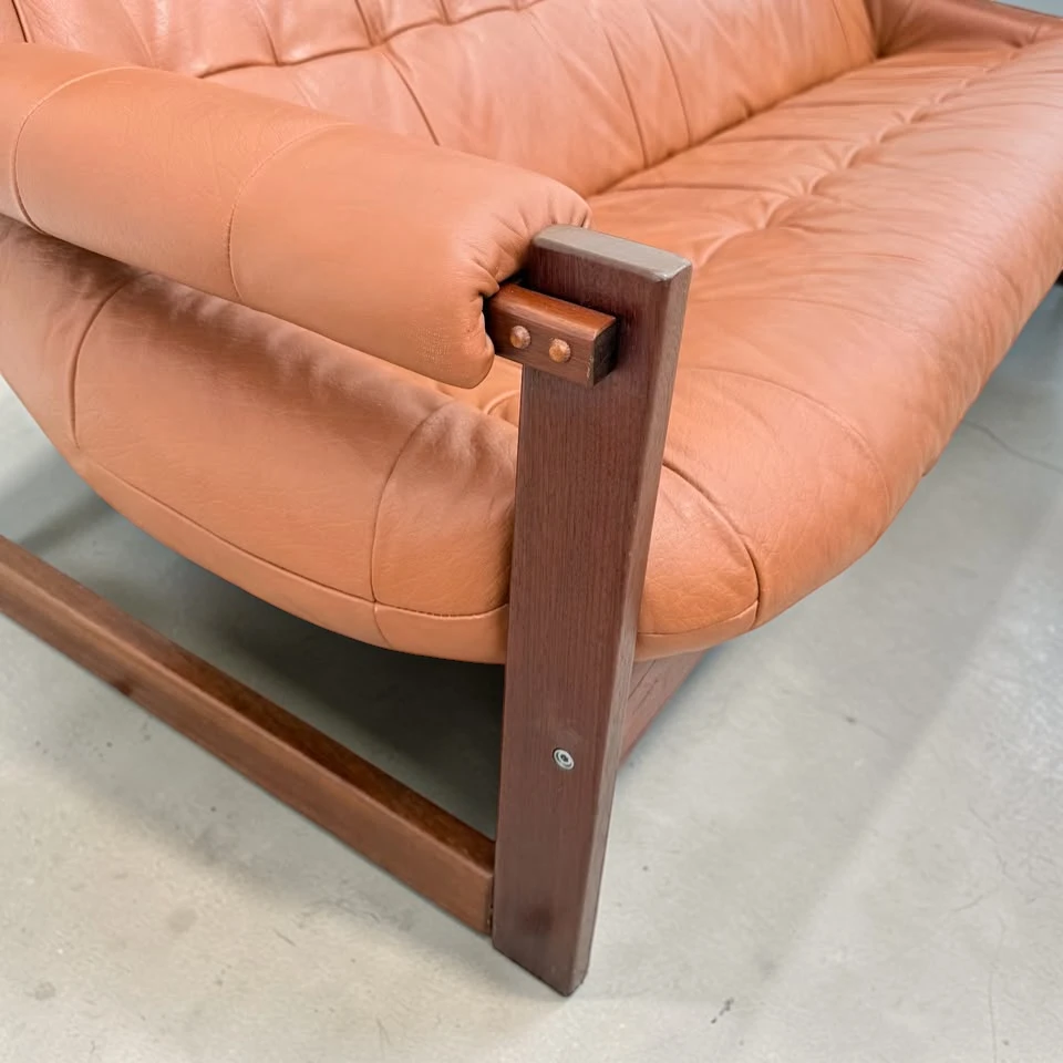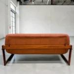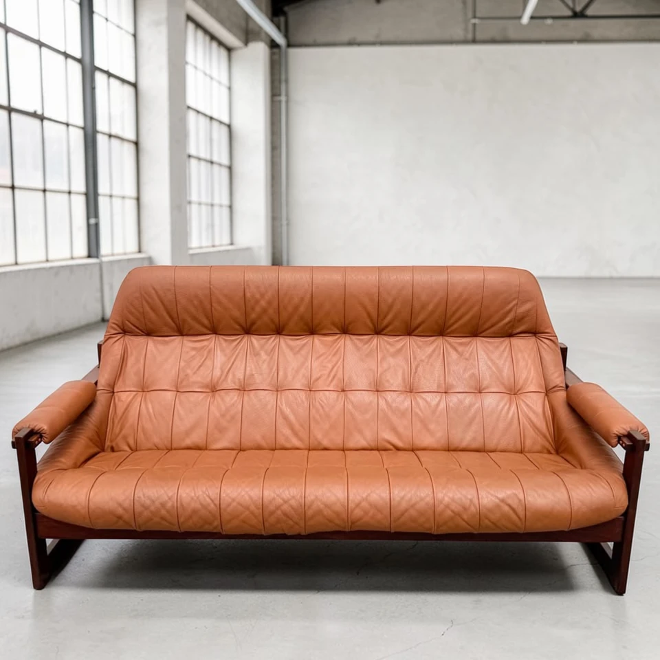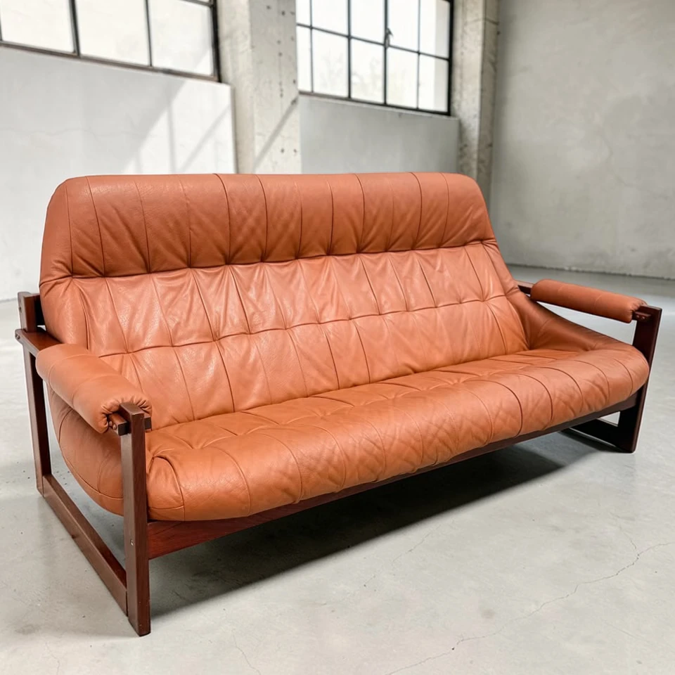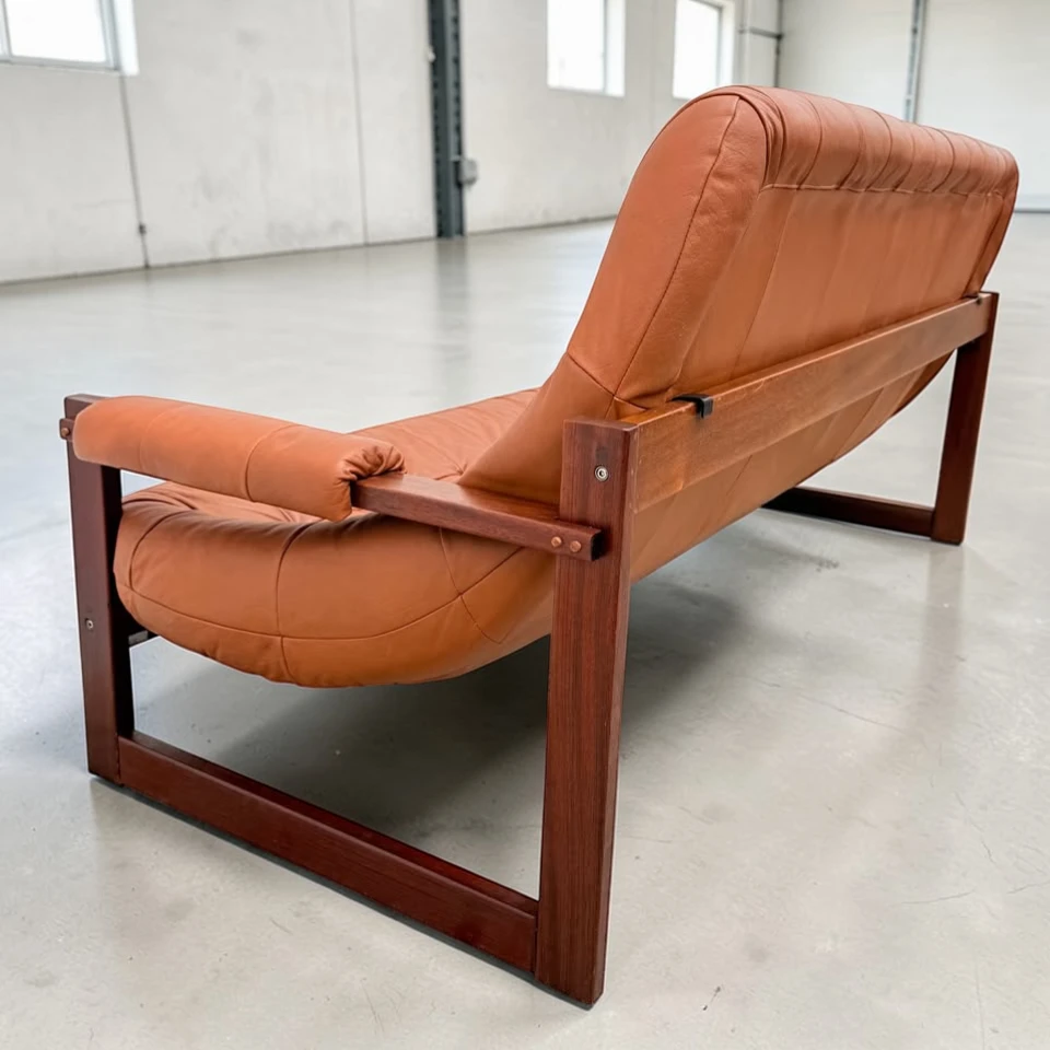 The rich, supple leather has been meticulously cleaned and conditioned, maintaining its natural patina and softness while highlighting its exceptional care over the decades. The rosewood frame is sturdy, freshly oiled, and displays the deep, warm tones and striking grain patterns characteristic of Brazilian rosewood (Jacaranda). This sofa is not only a visually stunning piece but also supremely comfortable, embodying Lafer’s philosophy of ergonomic luxury.