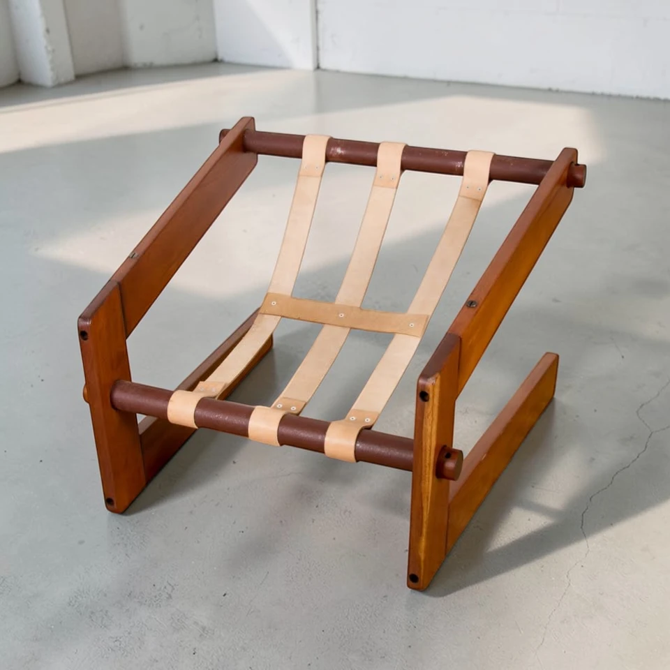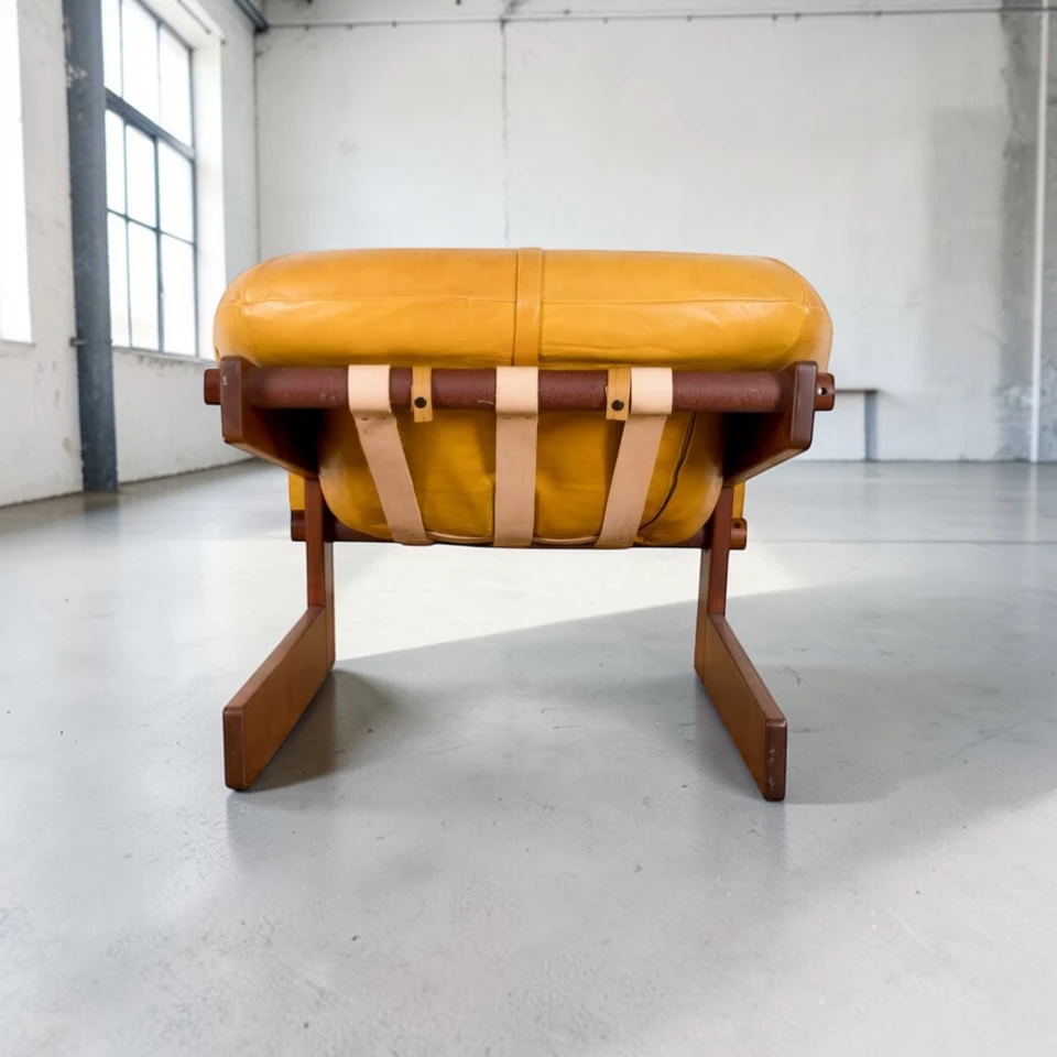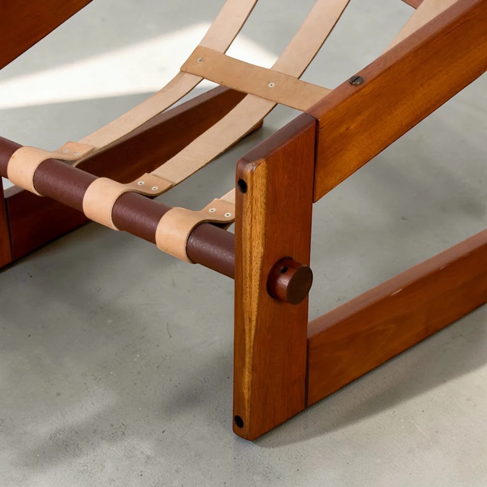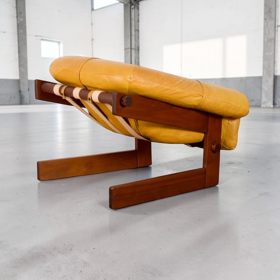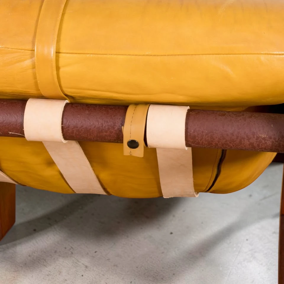 The lounge chair features a sling-style seat in yellow leather, gracefully suspended by replaced leather straps over a refinished solid jacaranda wood frame. Its organic, low-slung silhouette is both inviting and visually striking—perfect for collectors of mid-century modern furniture, Brazilian modernist design, or anyone seeking a statement piece.