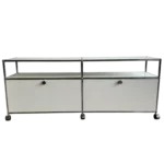 The console features two drop-down doors that open smoothly and lock securely with the twist of a coin. This clever mechanism, characteristic of USM Haller design, provides both security and ease of use. The doors descend gently, revealing interior storage perfect for media components, gaming consoles, or office supplies.