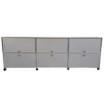 USM Haller XL 3×2 silver storage unit. 3 flip-up doors, 3 pull-out trays, 3 drop-down compartments. Mounted on casters for easy movement. Subtle silver finish – scratch-resistant. Excellent condition. 90 x 14 x 30.71 cm (35.4″ x 5.5″ x 12.1″). Perfect balance of access and concealment. Shop now.