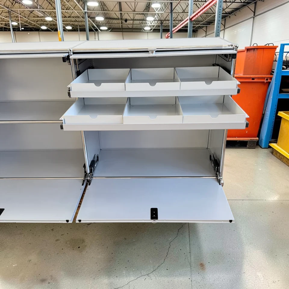 The bottom section features 3 drop-down compartments for larger items. The doors drop down to reveal concealed storage, keeping bulky items out of sight but easily accessible.