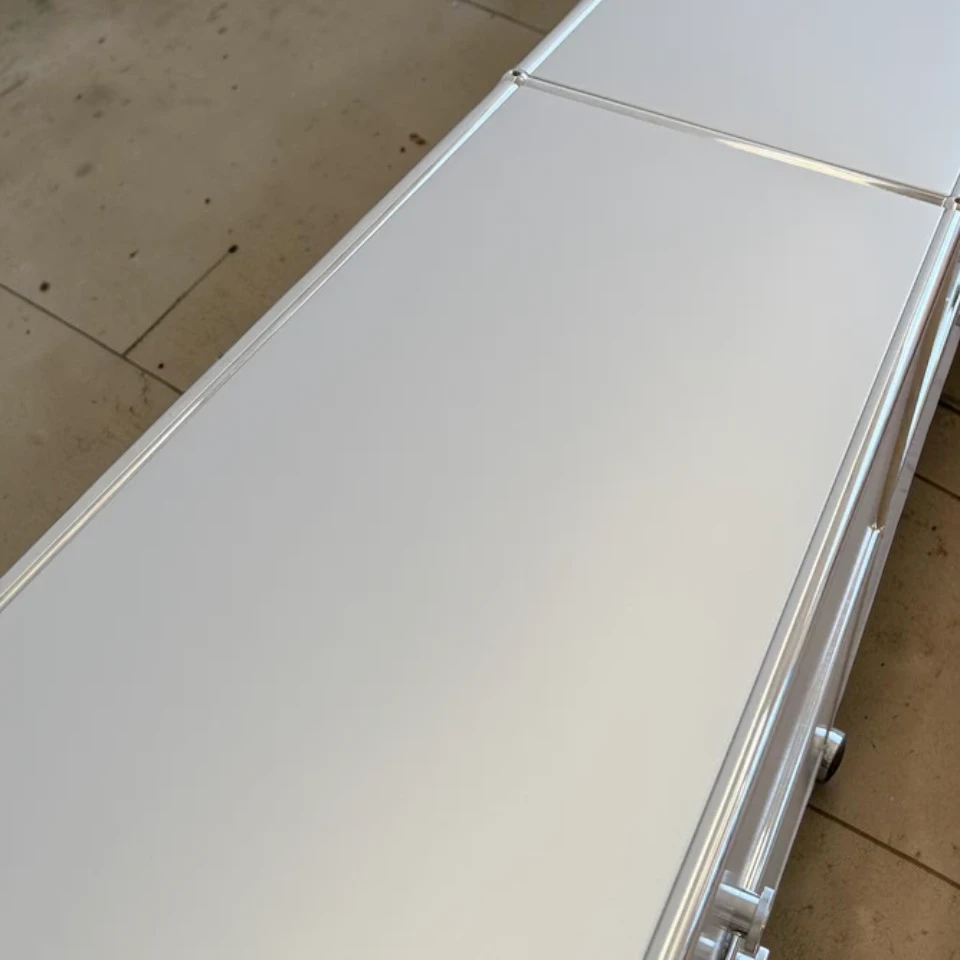 The silver finish is one of the most versatile and practical colors in the USM Haller palette. Unlike pure white, which can show marks easily, silver is highly resistant to scratches and maintains its sophisticated appearance even with daily use.