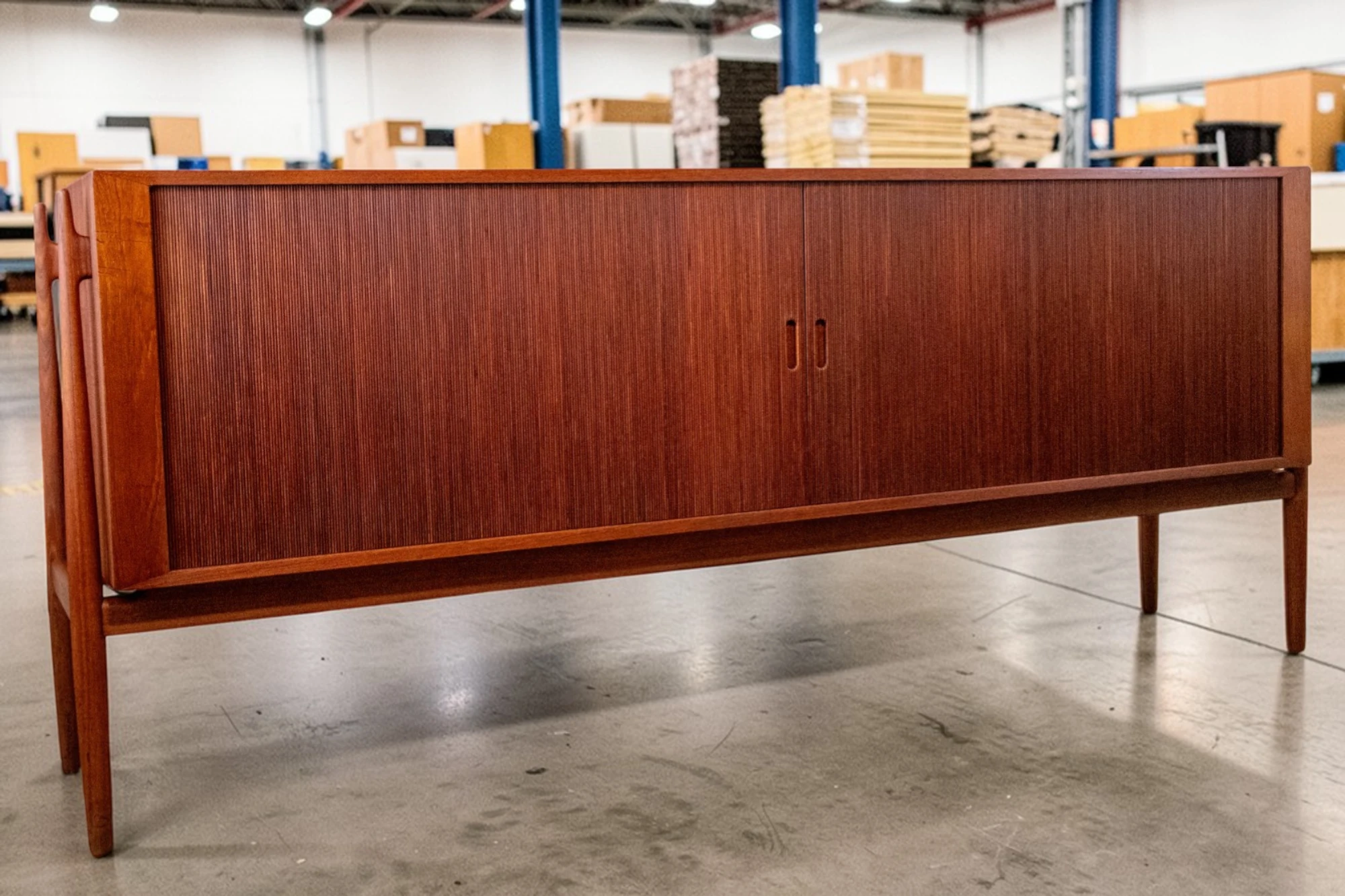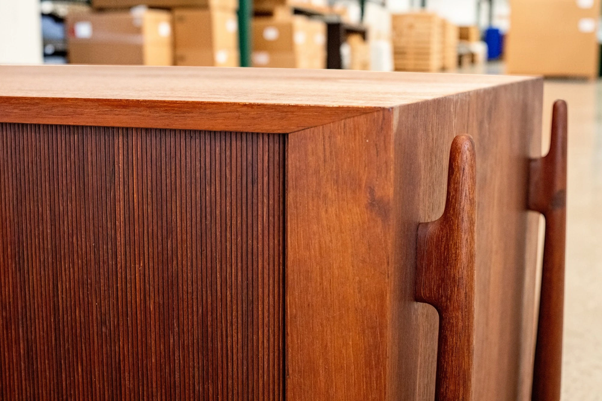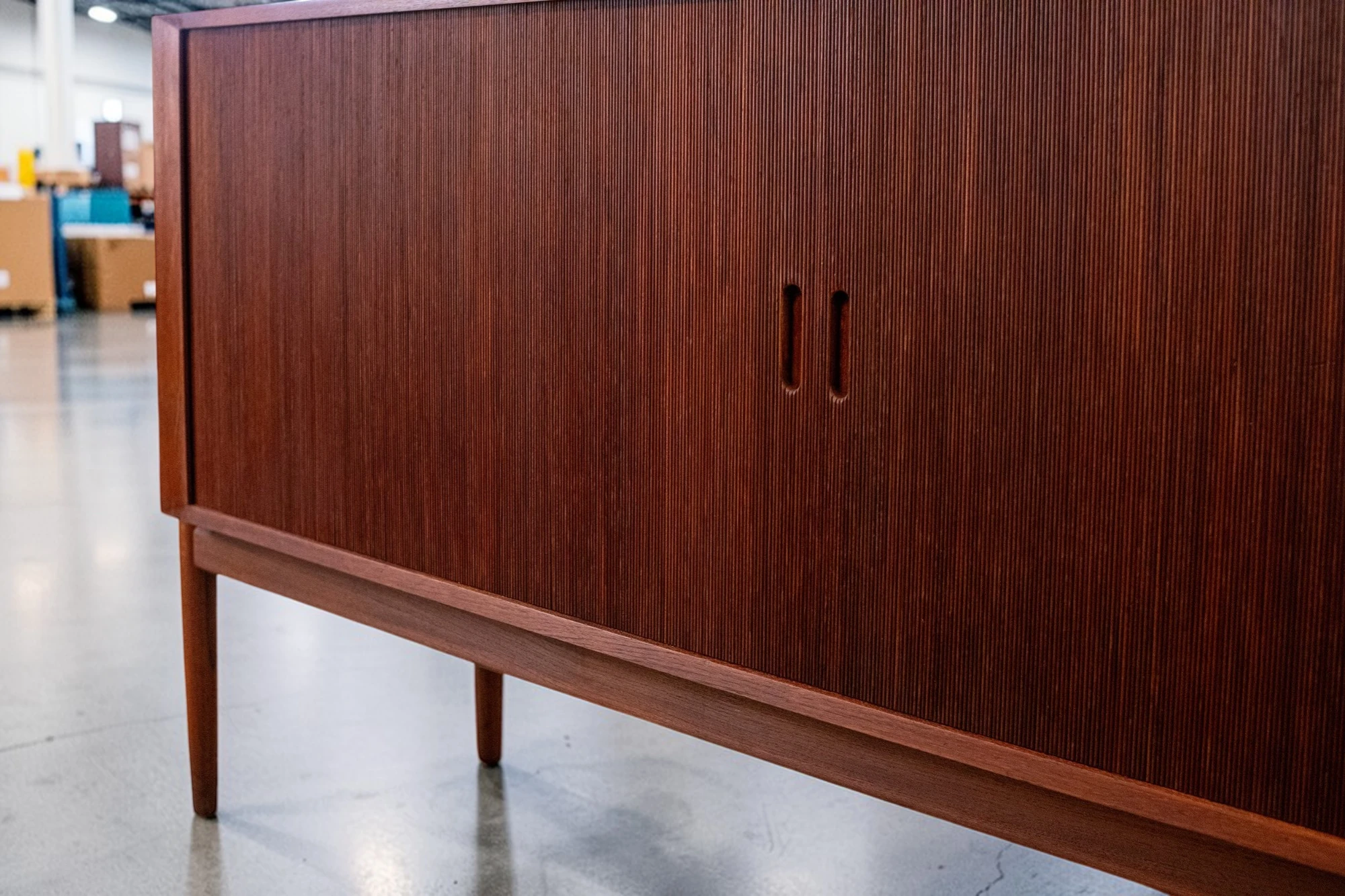 Crafted from rich solid teak, the credenza features elegant sculptural fins and masterful joinery that echo the spirit of Finn Juhl’s iconic designs, although this model is not officially attributed to him. The detailed craftsmanship includes stunning tambour doors that glide smoothly to reveal meticulously crafted removable trays on the left and an adjustable shelf on the right.