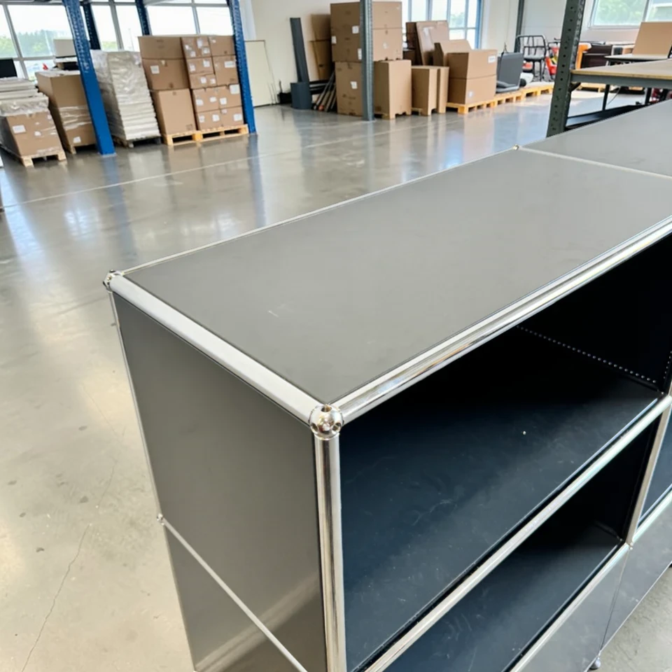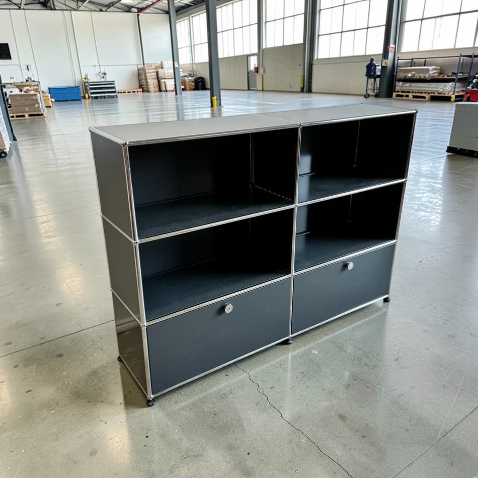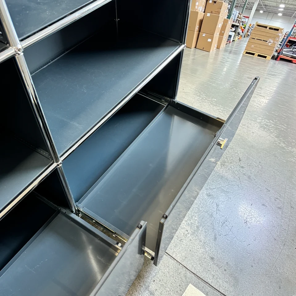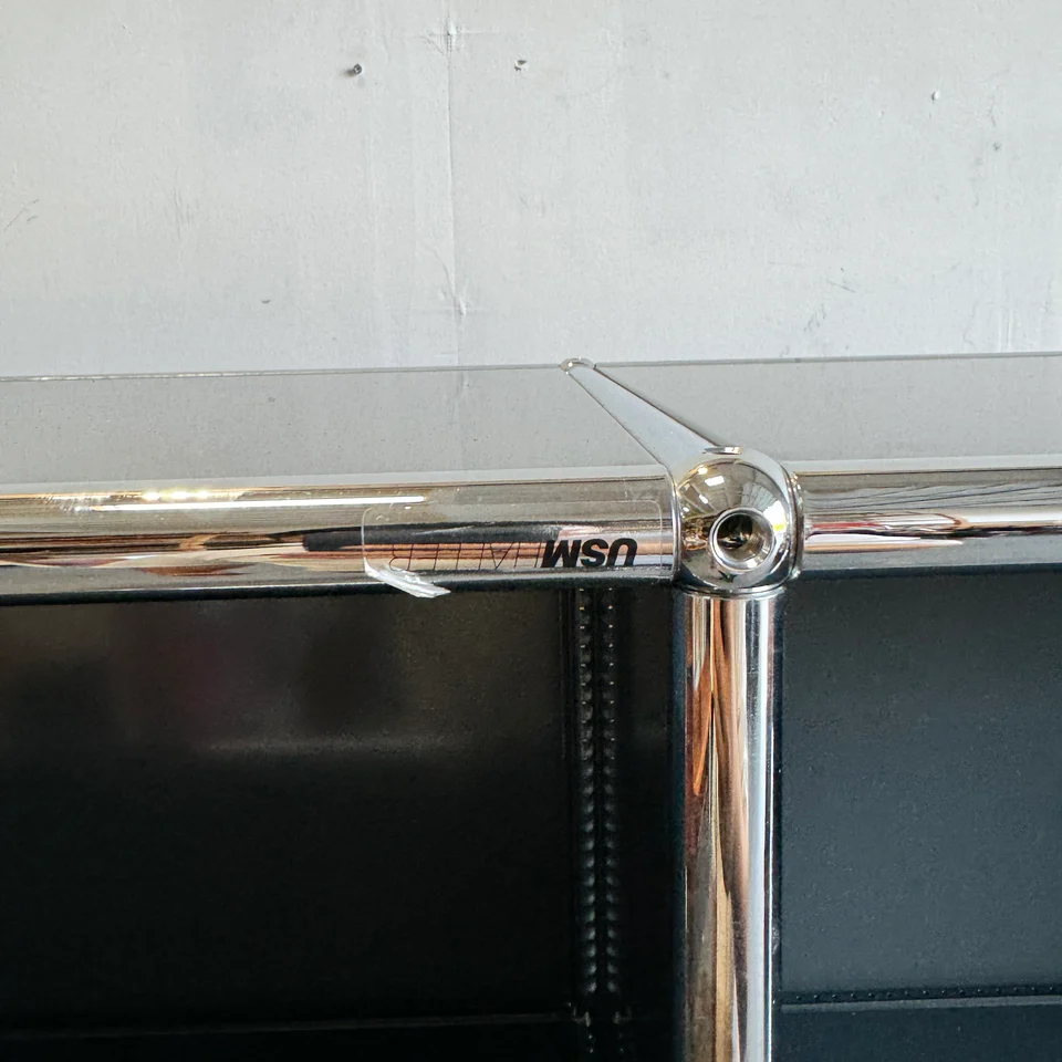 Crafted in Switzerland from powder-coated steel panels and chrome-plated steel tubing, this unit offers both structural integrity and visual appeal. Its sleek, durable construction has made USM Haller an icon in the world of mid-century modern and modular furniture.