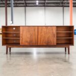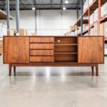 Discover the timeless beauty of this authentic Vintage Mid-Century Bernhard Pedersen Danish Rosewood Credenza, a true collector’s piece from the 1960s. Expertly crafted in Denmark, this sideboard represents the height of Danish Modern design, with its minimalist silhouette, fine joinery, and stunning rosewood veneer.