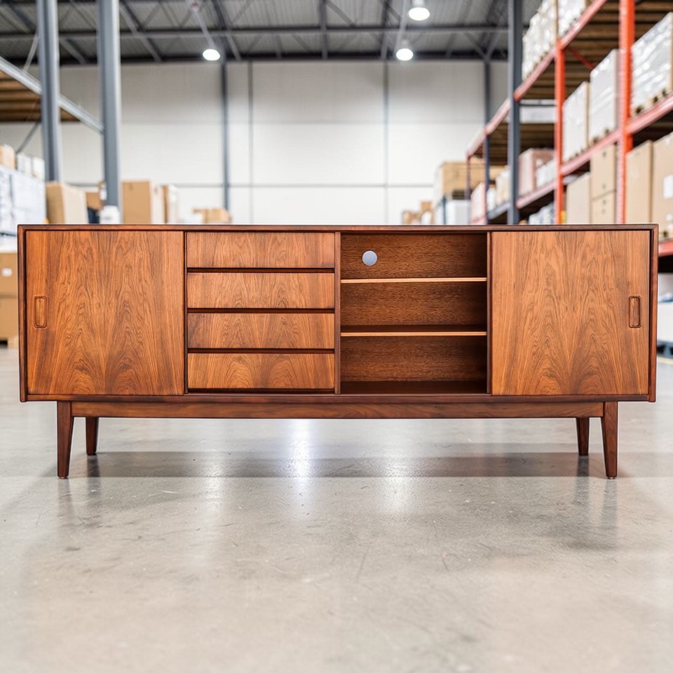 Behind the beautifully book-matched sliding doors, you’ll find two spacious storage compartments with adjustable interior shelves, perfect for organizing dinnerware, records, or office essentials. The sleek, handle-free design ensures a clean, uninterrupted façade that lets the wood’s natural beauty shine. The three drawers provide additional storage, each fronted with matching rosewood grain for visual continuity.